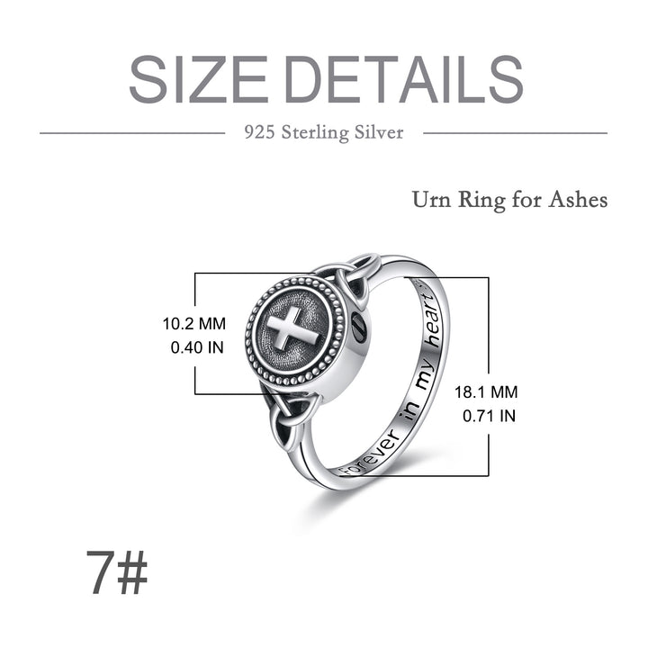 Crafted in sterling silver with retro finish. Stone-free cross urn ring. Engraved with “Forever In My Heart.” Includes secure compartment.