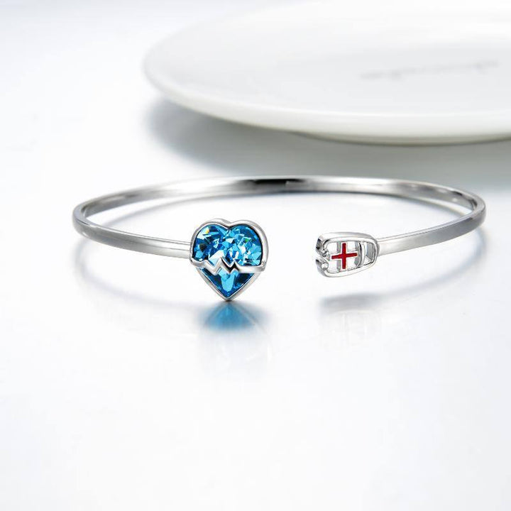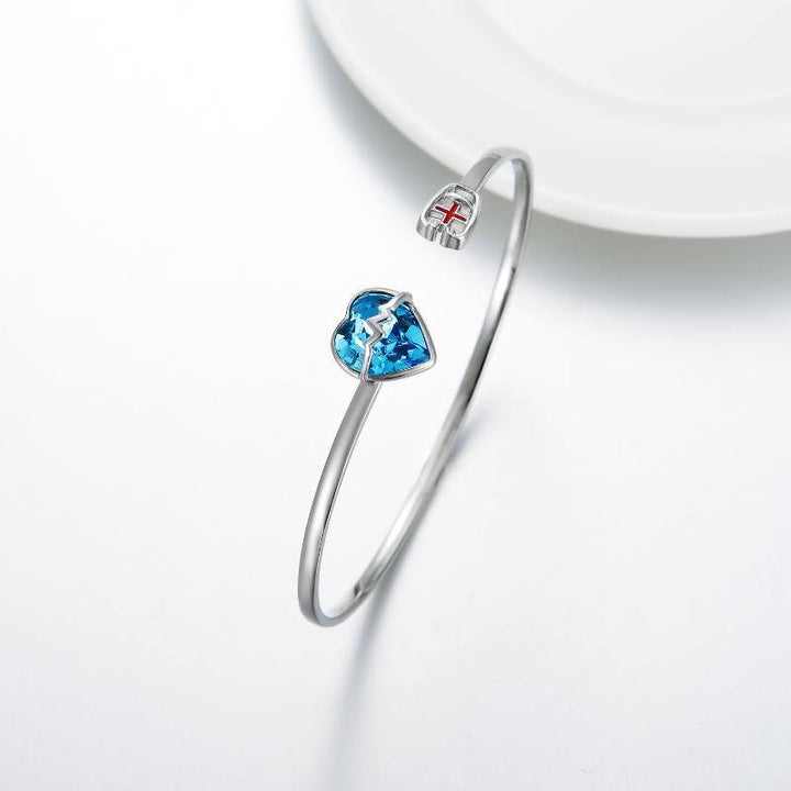Sterling Silver Heart Crystal With Stethoscope Pendant Bangle For Women