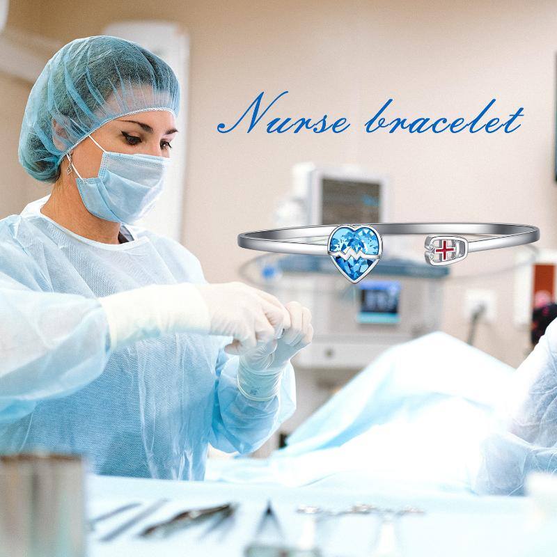 Crafted in sterling silver with white gold plating. Features blue heart-shaped crystal and stethoscope motif. Bangle-style bracelet with secure fastening.