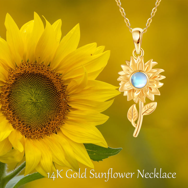 This Circular Pendant Necklace is crafted from Genuine 14K Yellow Gold and features a Captivating Moonstone Centerpiece, elegantly Surrounded by a Delicate Sunflower Motif.