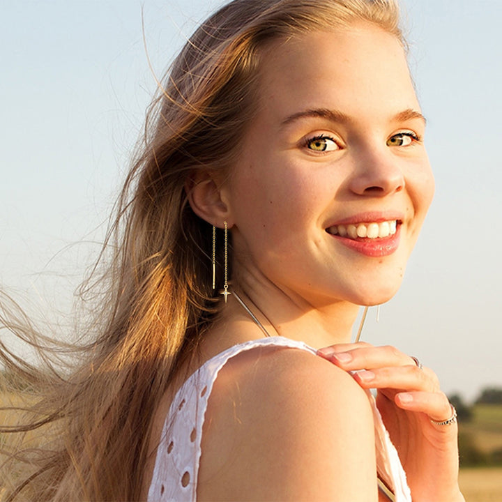 These 14K Gold Round Moissanite Cross Drop Earrings by YFN are an exquisite and timeless accessory for women. Crafted from high-quality 14K gold, these drop earrings feature brilliant round Moissanite stones expertly set in a classic cross design, ensuring durability and radiant shine with a touch of sophistication and grace.