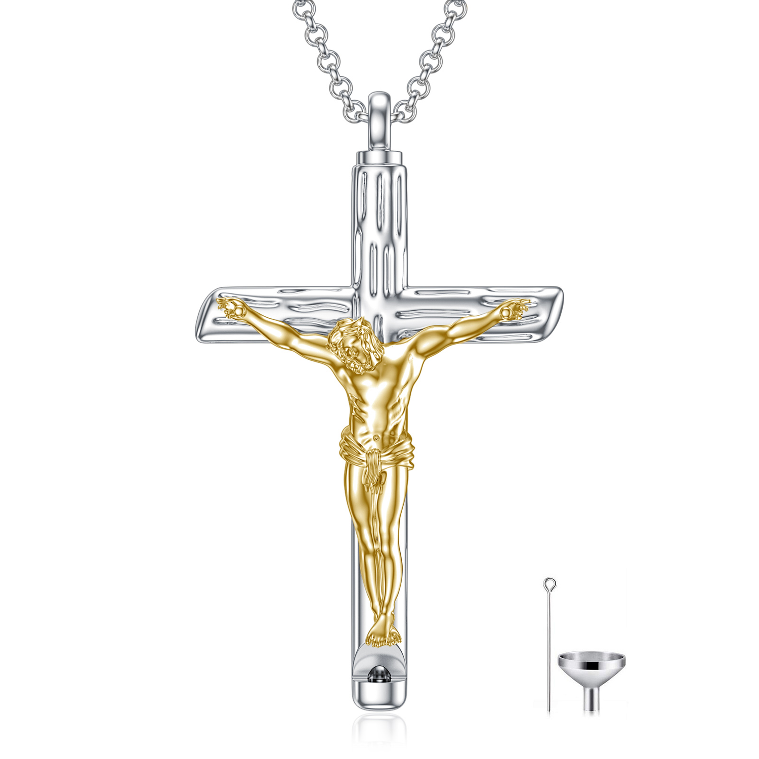 This Urn Necklace for Ashes is crafted from Sterling Silver with Two-tone White Gold and Yellow Gold finishes, featuring a Textured Cross (Jesus) design.