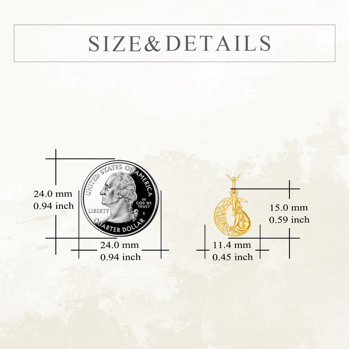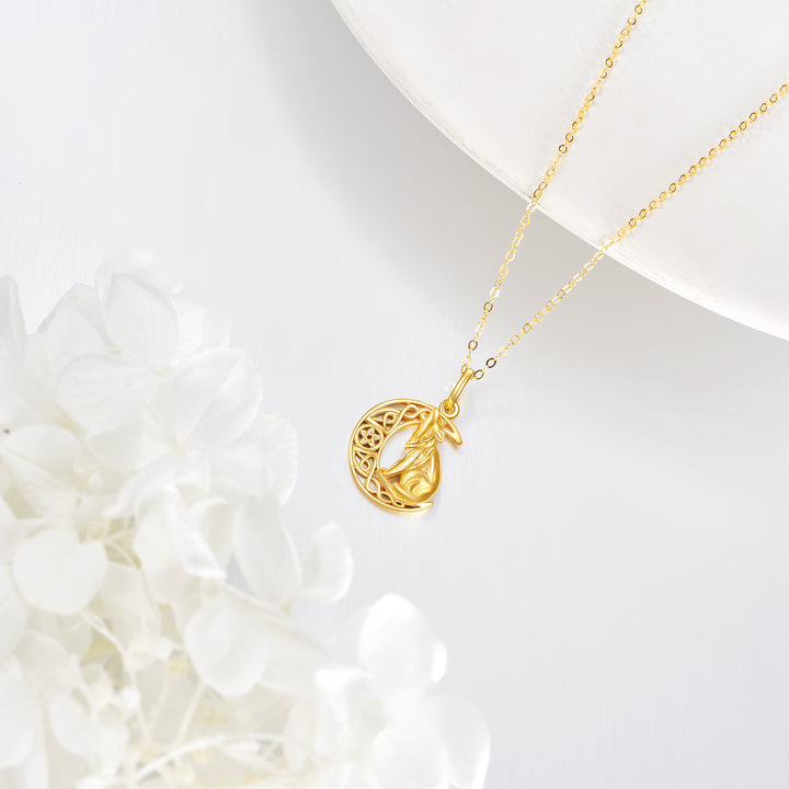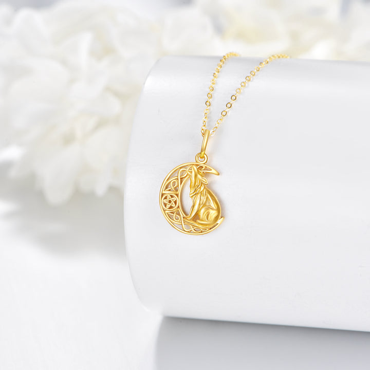 14K Gold Wolf & Celtic Knot & Moon Pendant Necklace