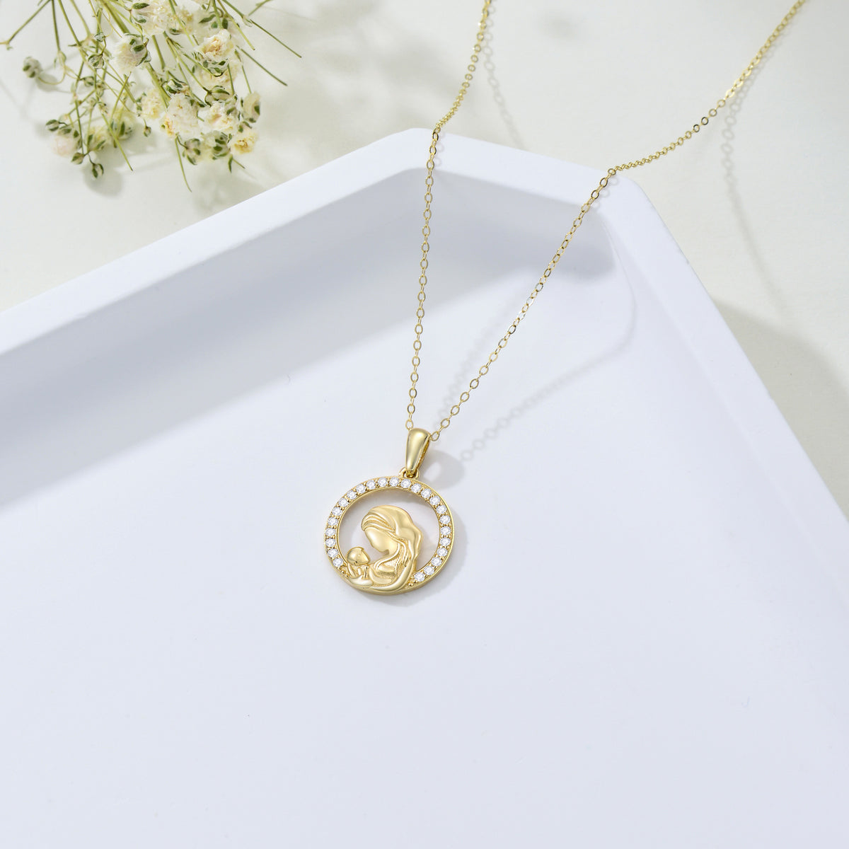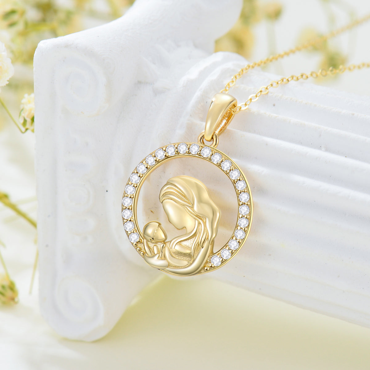 14K Gold Cubic Zirconia Mother & Circle Pendant Necklace