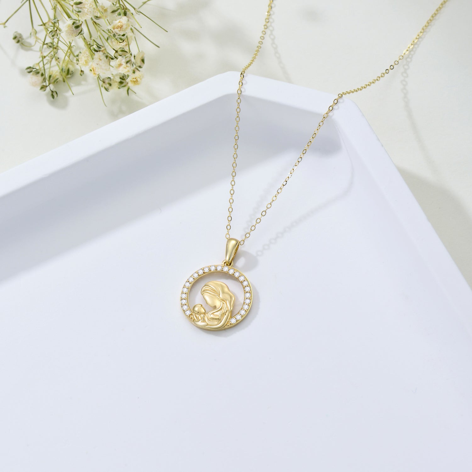 Crafted from solid 14K Gold. This is a Circular Pendant Necklace featuring a Mother & Circle design, set with Cubic Zirconia stones.