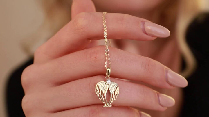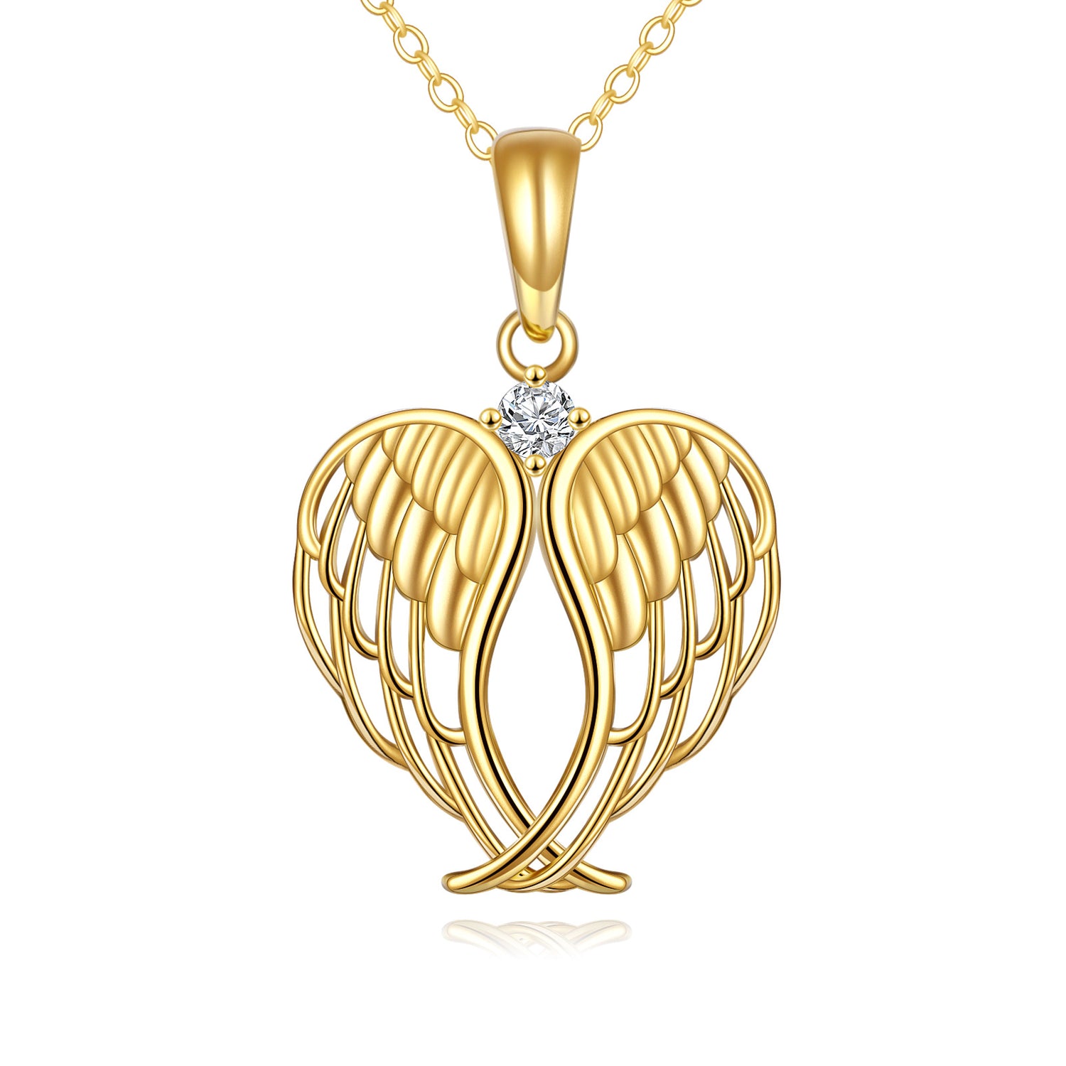 This 14K Gold Cubic Zirconia Angel Wings Heart Shaped Pendant Necklace by YFN is an elegant necklace for women. Crafted from luxurious 14K gold, it showcases intricately detailed angel wings adorned with sparkling Cubic Zirconia, embodying grace and sophistication.