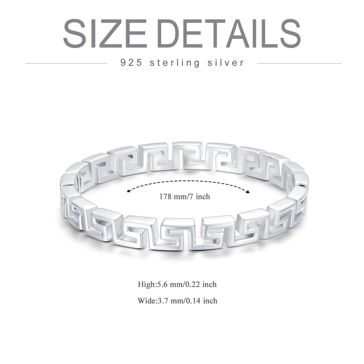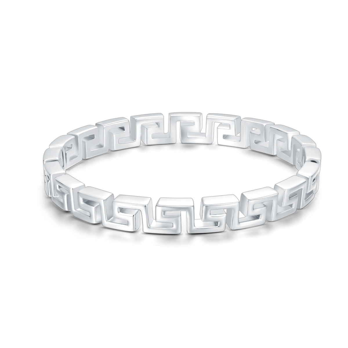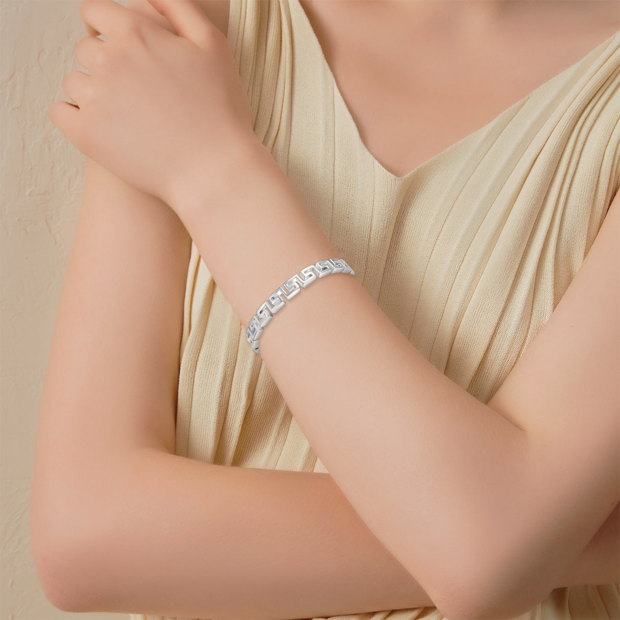 Sterling silver with white-gold plating; engraved key motif; bangle design with secure closure.