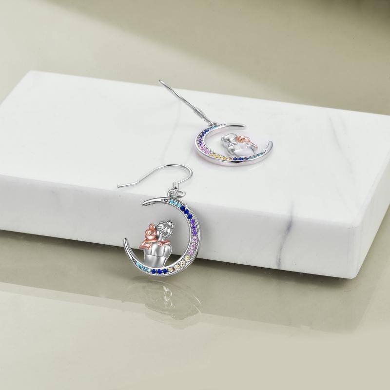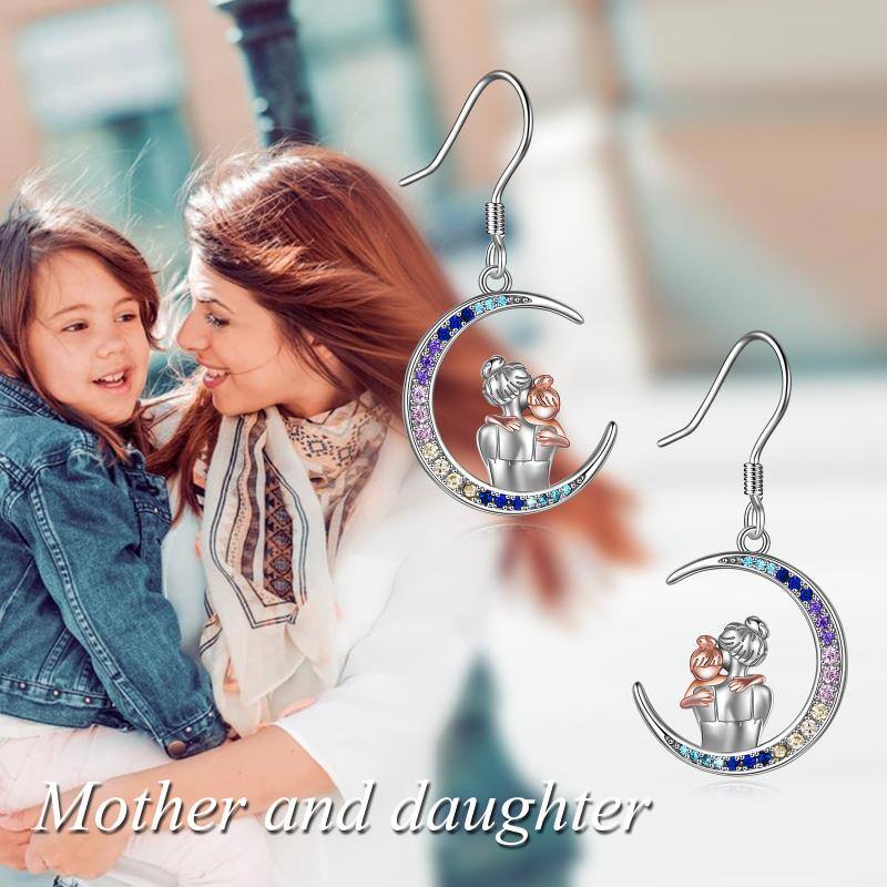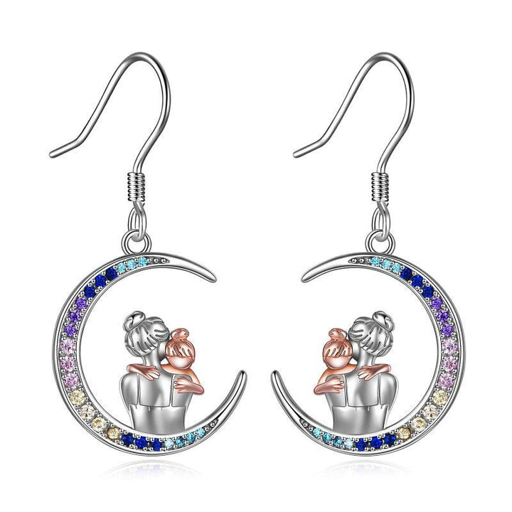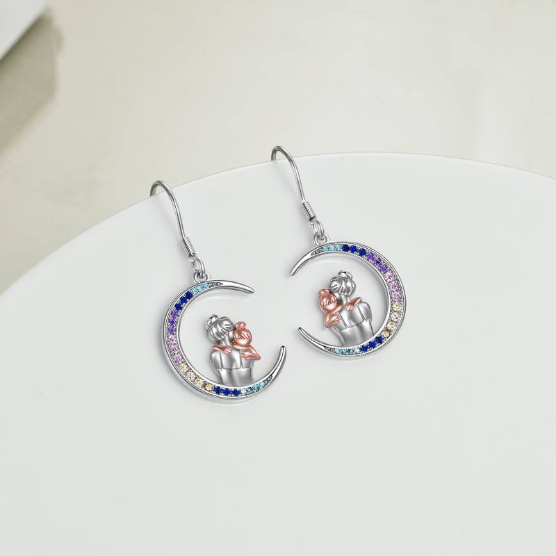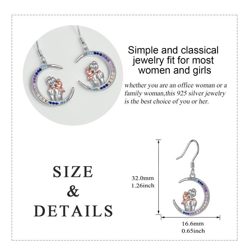 Sterling Silver Two-Tone Moon Cubic Zirconia Mother & Daughter Drop Earrings For Women