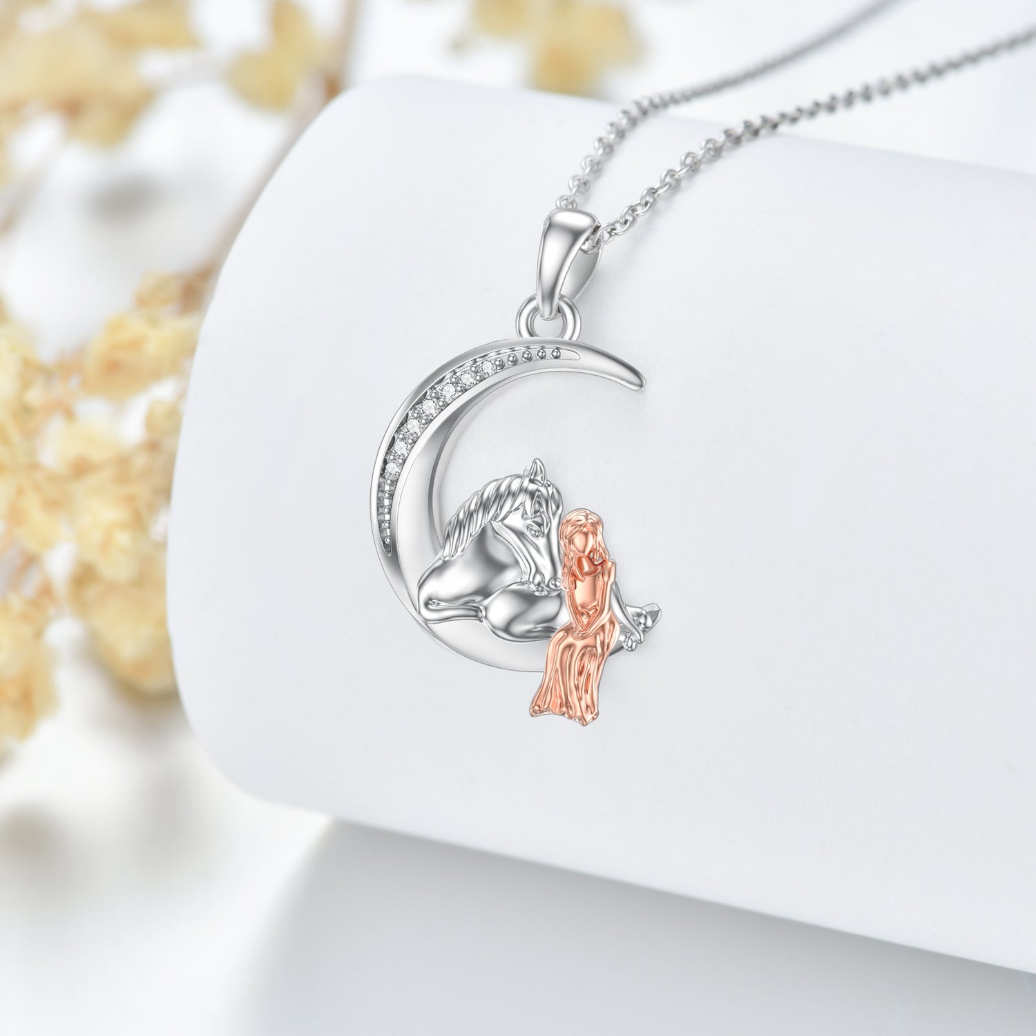 Sterling Silver Two-tone Round Diamond Horse & Moon Pendant Necklace