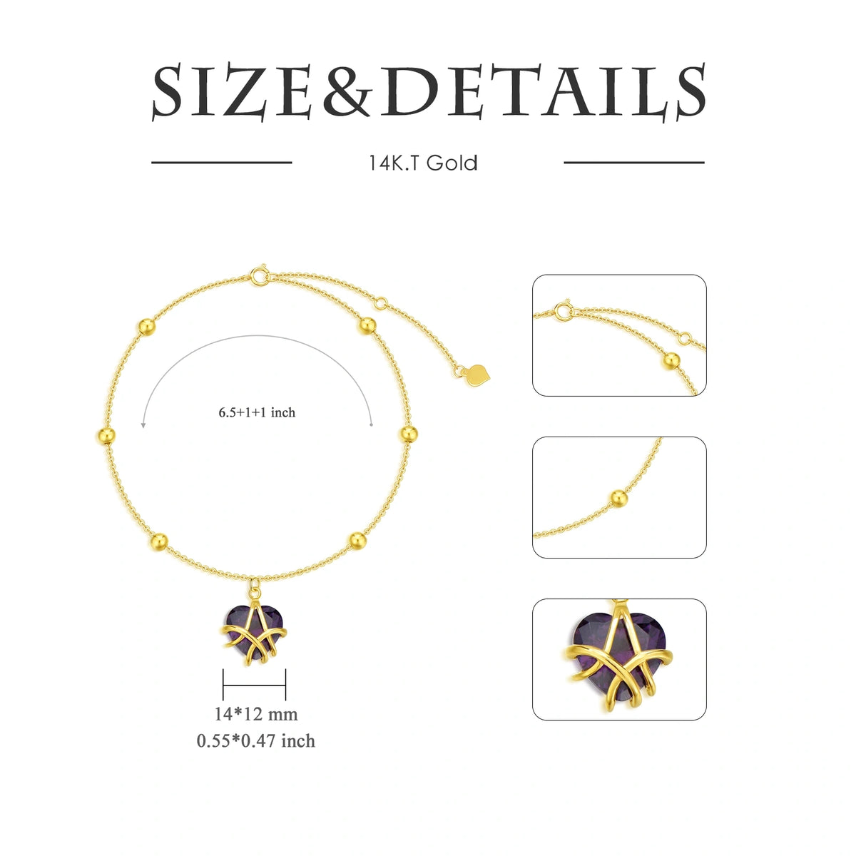 This Heart-Shaped Charm Bracelet is crafted from Premium 14K Gold, Featuring a Mesmerizing Purple Crystal.