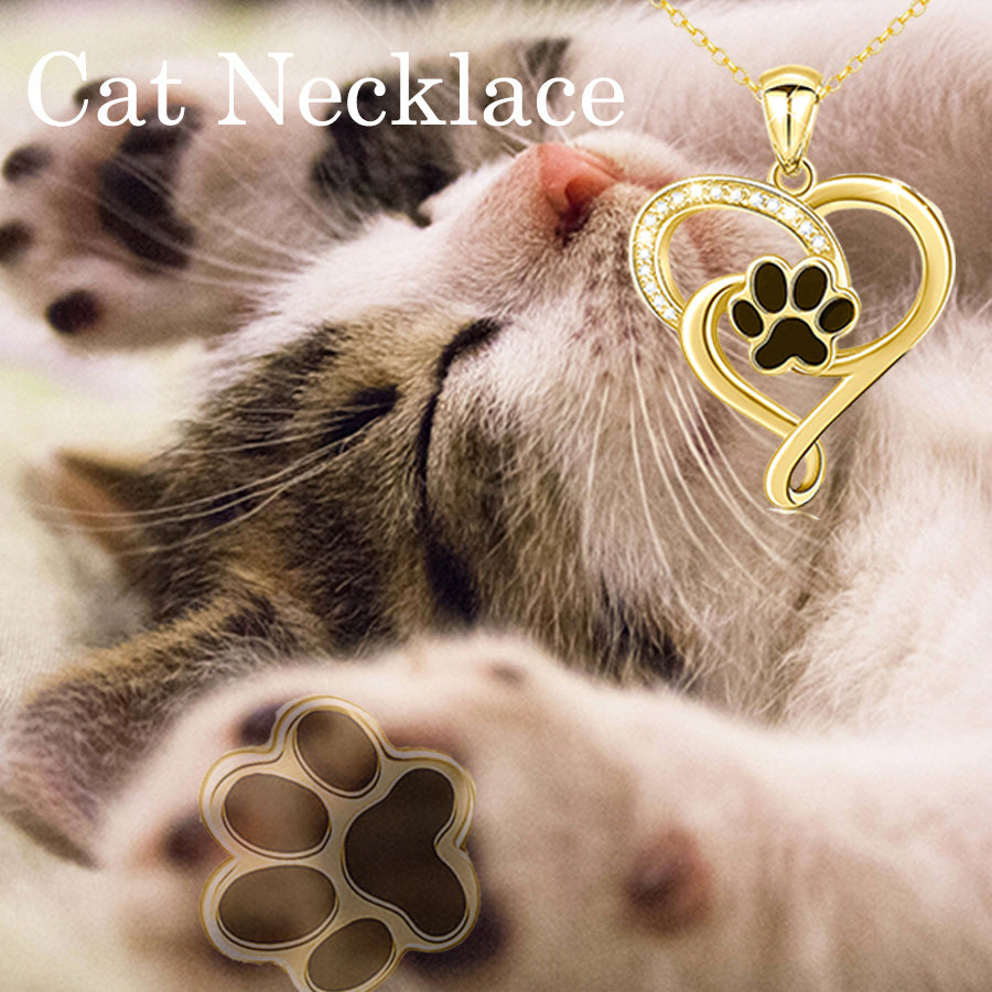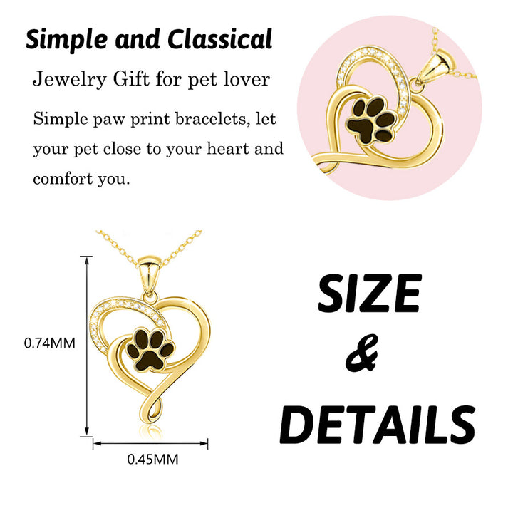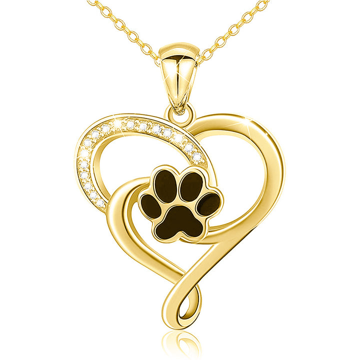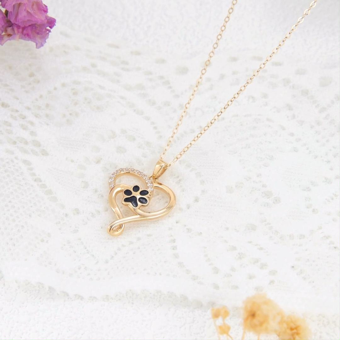 14K Gold Round Zircon Paw & Heart Pendant Necklace