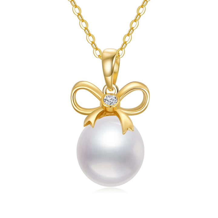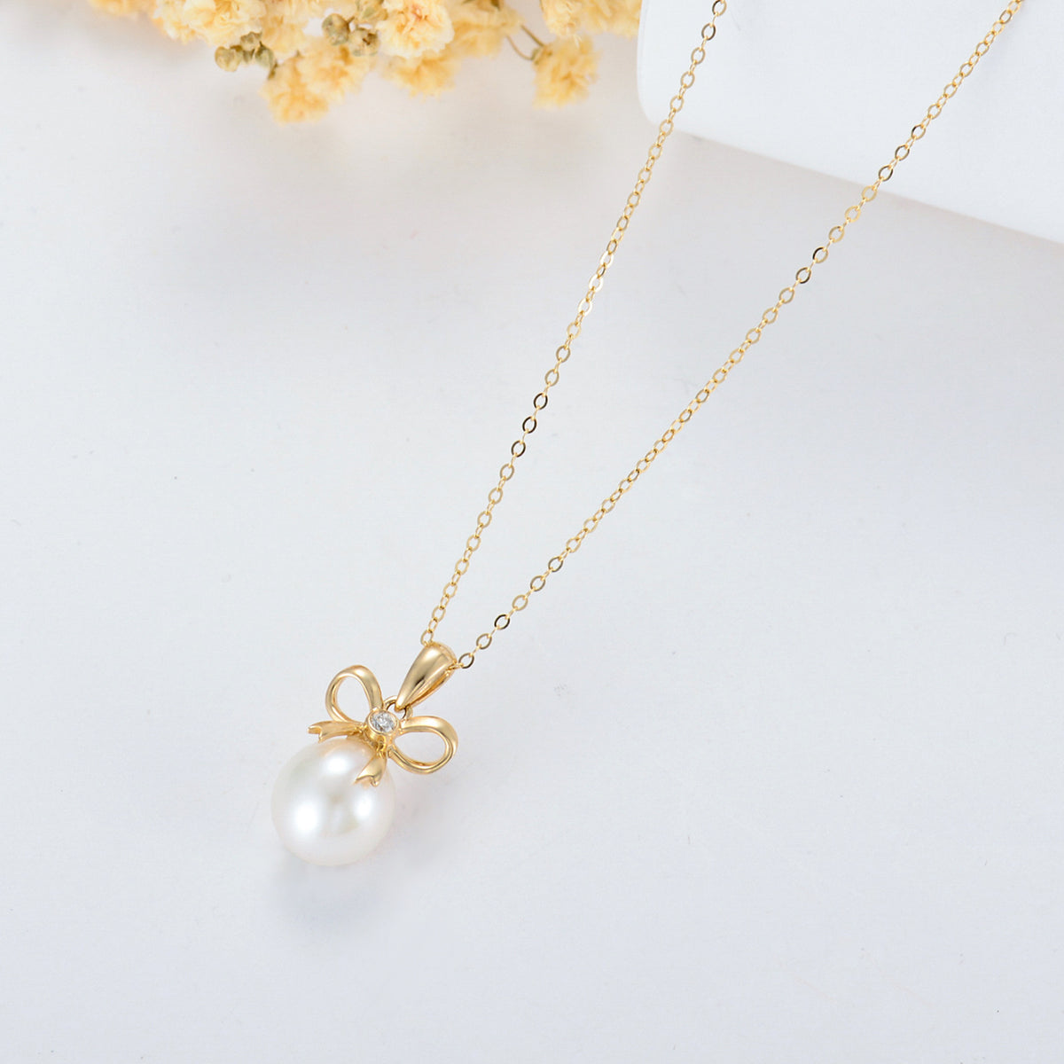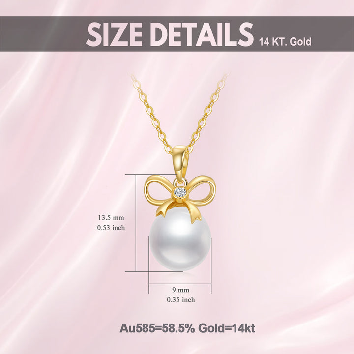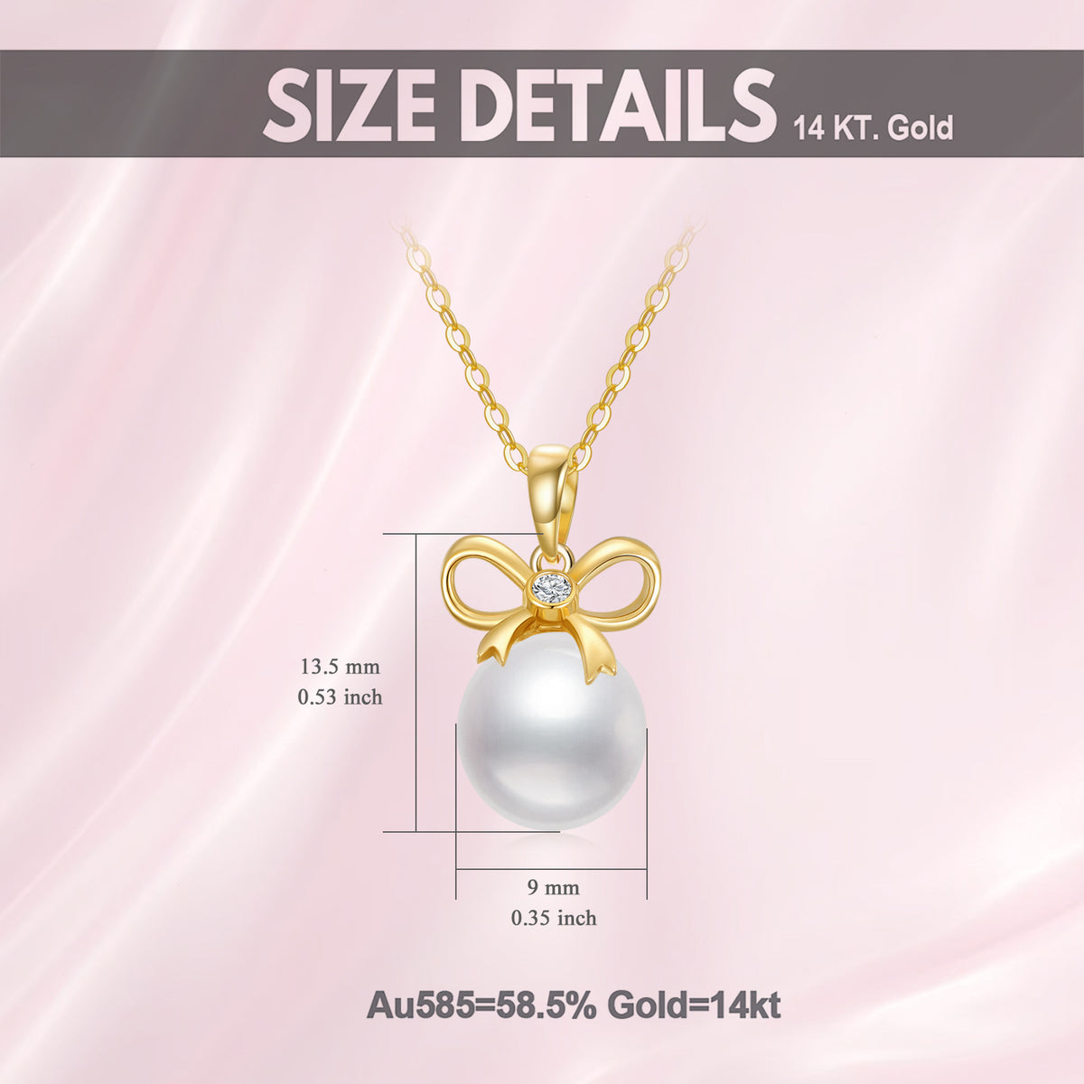 14K gold pendant with round pearl and gold bow motif. Includes matching 14K gold chain. Pendant and chain dimensions per brand specifications.