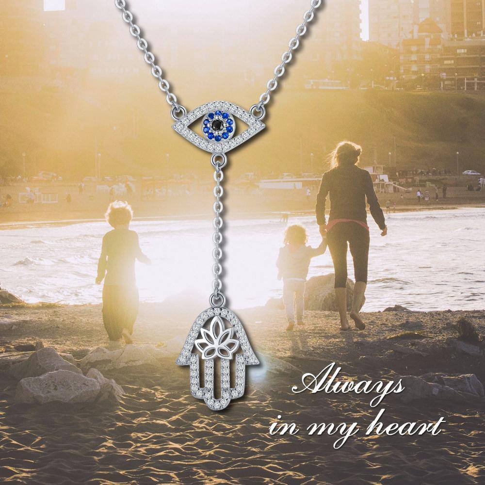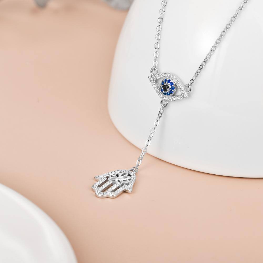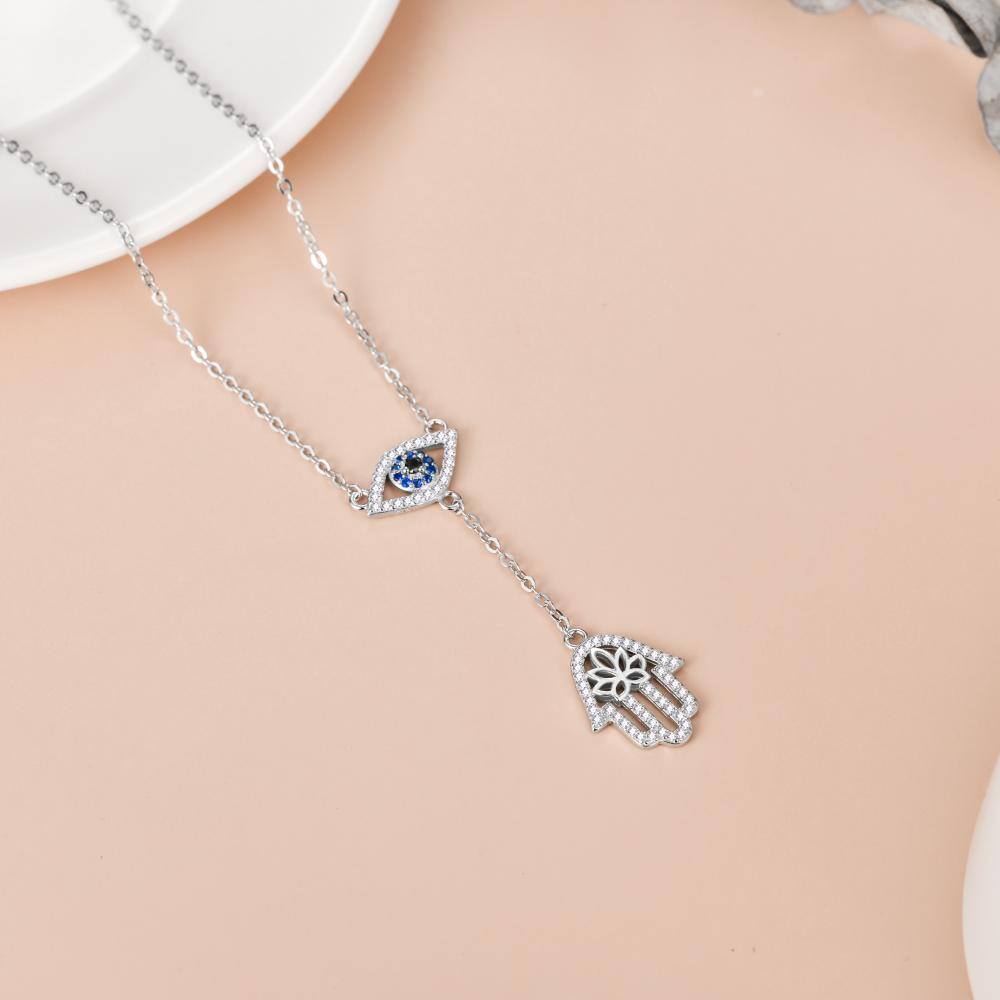 This Round Non-adjustable Y-Necklace is crafted from High-Quality Sterling Silver with White Gold Plating, Adorned with Cubic Zirconia and Featuring Evil Eye and Hamsa Hand Motifs.