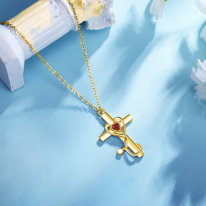 Crafted from 14K Gold, featuring a Heart Pendant Necklace with Cubic Zirconia, a Garnet center, and Cross & Stethoscope Motifs.