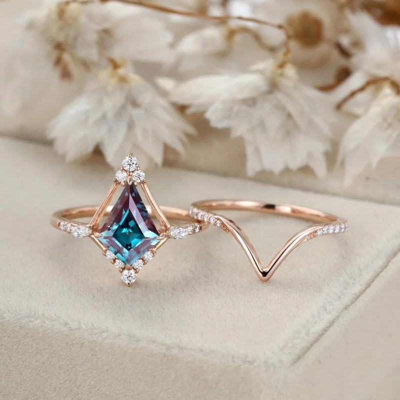 This 14K Rose Gold Kite Cut Alexandrite Engagement Ring Set with Moissanite by YFN is a symbol of sophisticated and unconventional commitment. The kite-cut Moissanite center stone offers exceptional fire, set against the enchanting color-change of Alexandrite accents, giving the ring a truly magical and romantic vibe. This design is perfect for the modern woman who seeks a distinctive, luxurious piece that reflects her individuality. It represents enduring love and the beautiful, transformative journey of partnership.