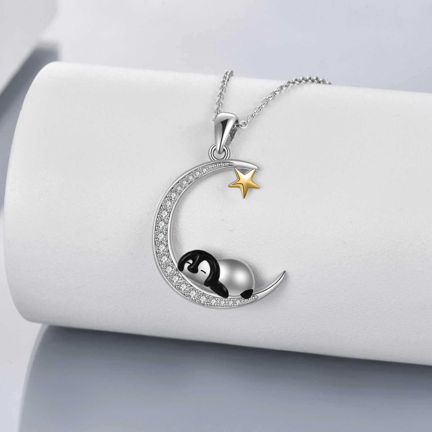 Crafted in sterling silver with white or yellow gold plating and clear cubic zirconia. Penguin and crescent moon motif. Includes matching chain.
