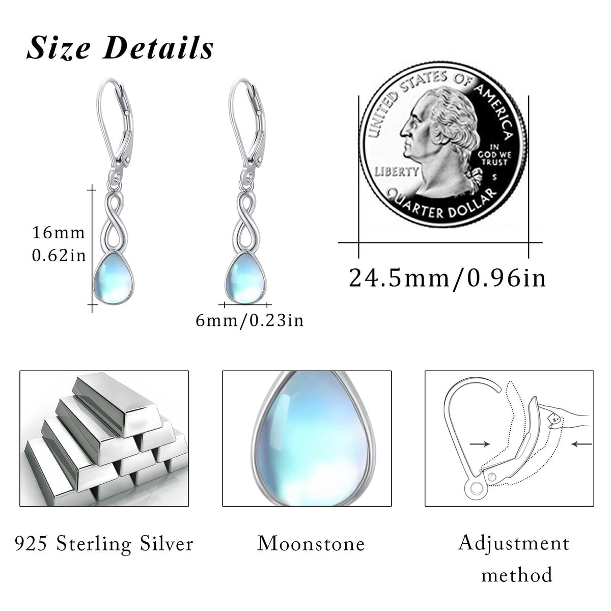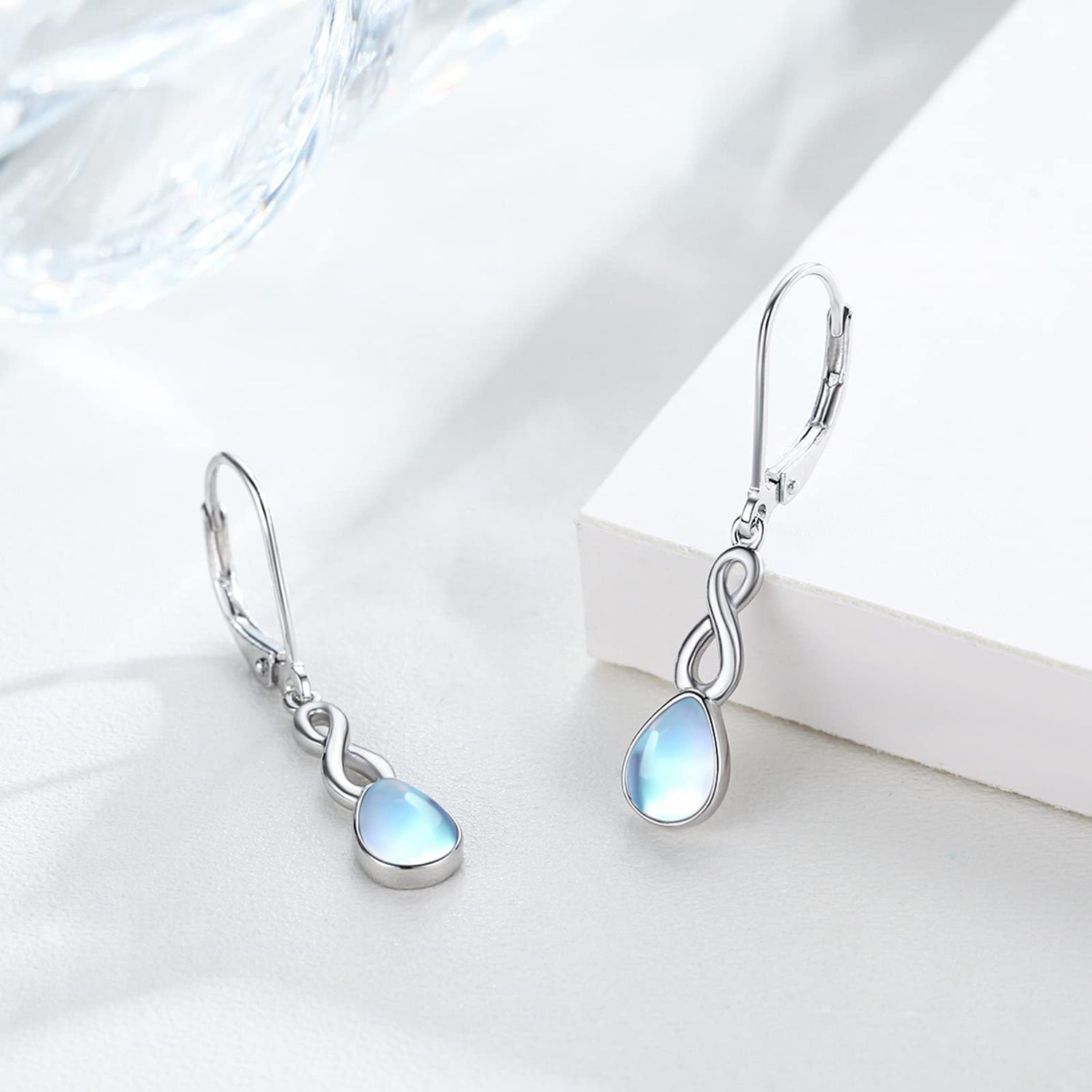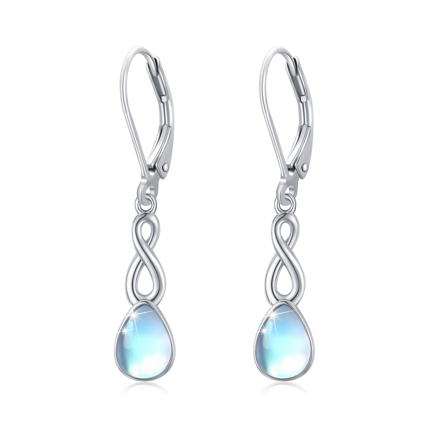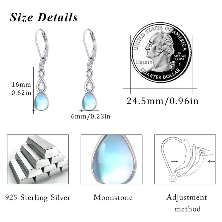 Crafted from high-quality Sterling Silver with White Gold Plating, these Lever-back Earrings feature a captivating Moonstone set in a timeless Infinity Symbol design.