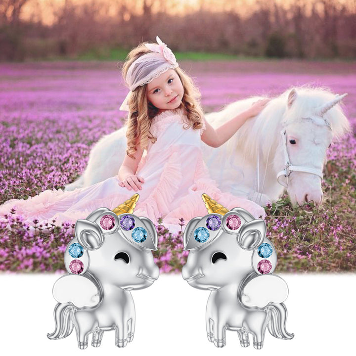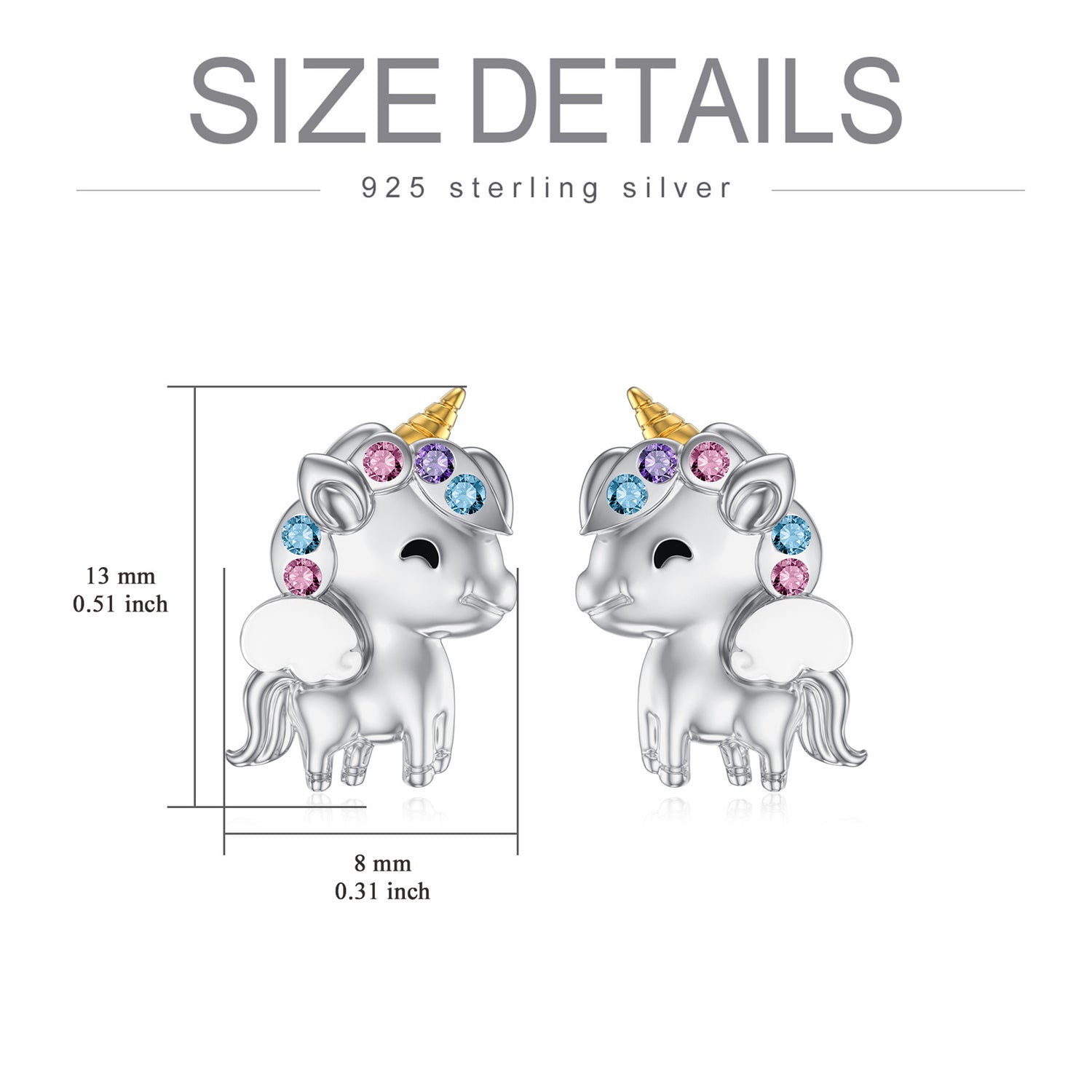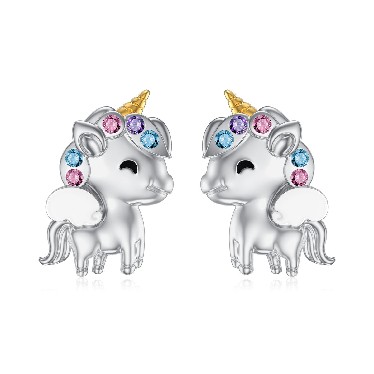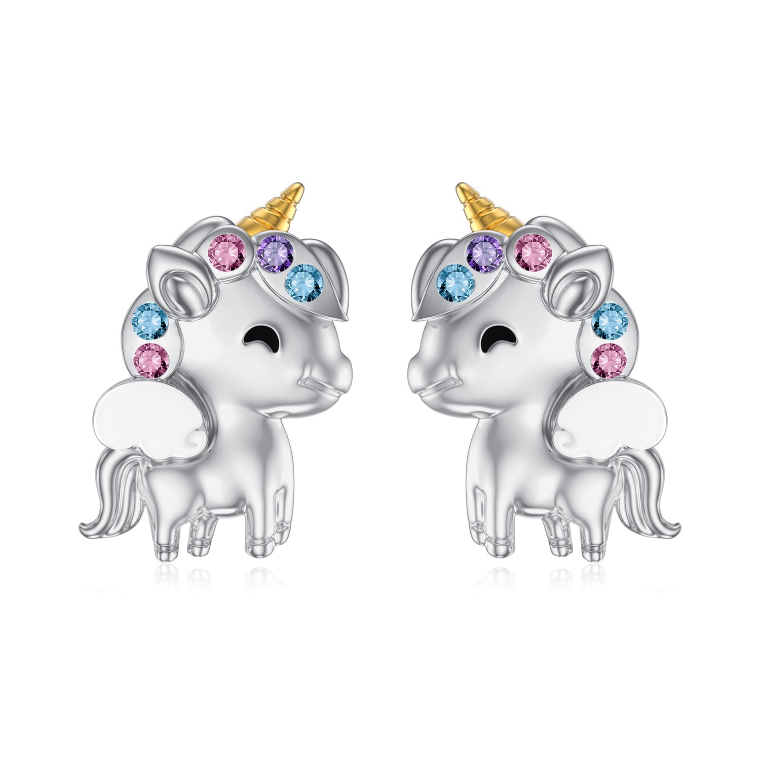 Crafted in sterling silver with white gold and yellow gold finishes, featuring circular-shaped crystals and unicorn motifs. Stud-post construction; dimensions per the brand.