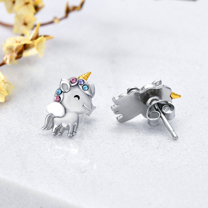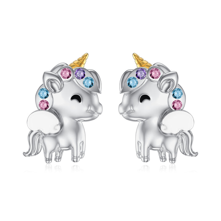 Sterling Silver Two-tone Circular Shaped Crystal Unicorn Stud Earrings