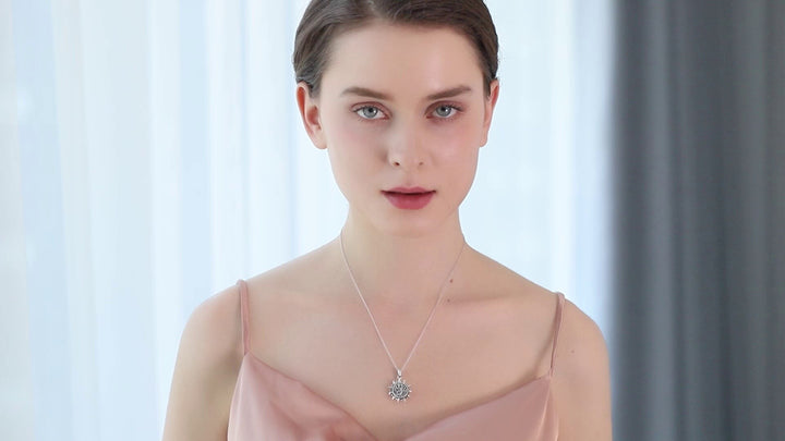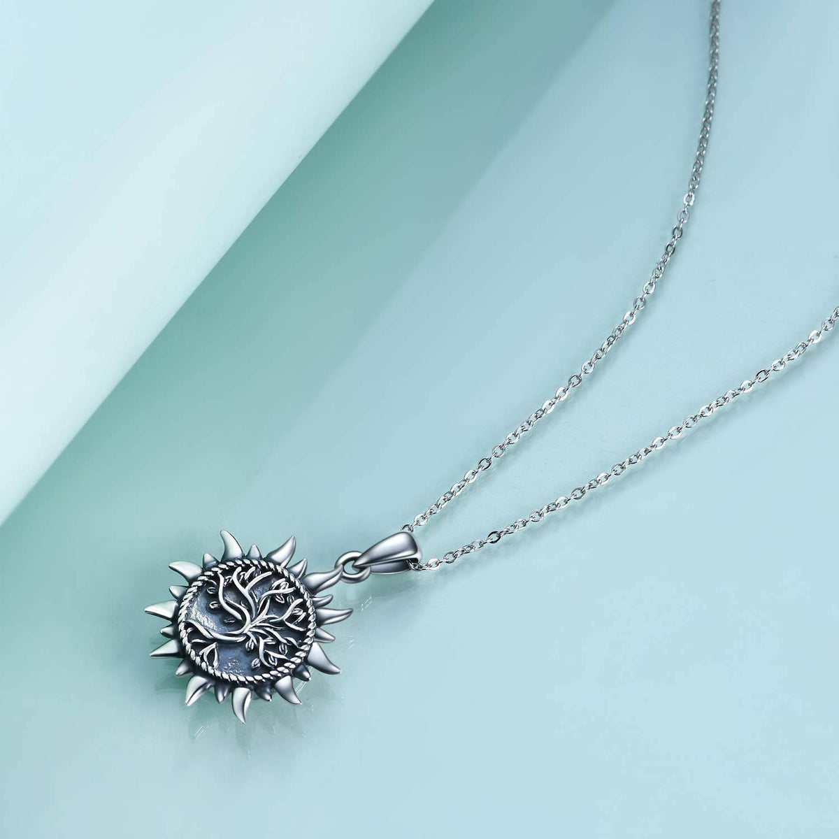 Sterling silver; Tree of Life and sun motifs; urn compartment; chain; retro silver finish.