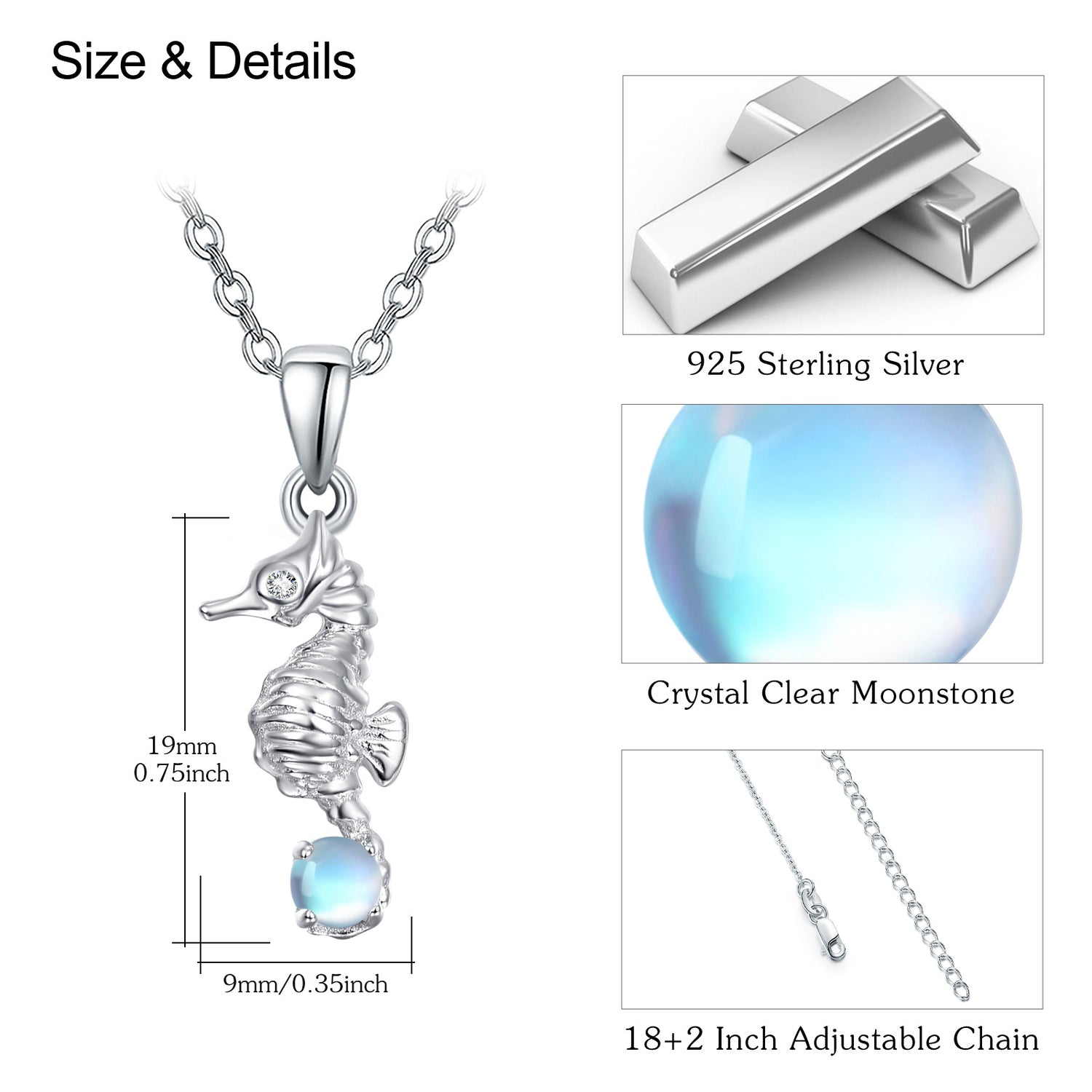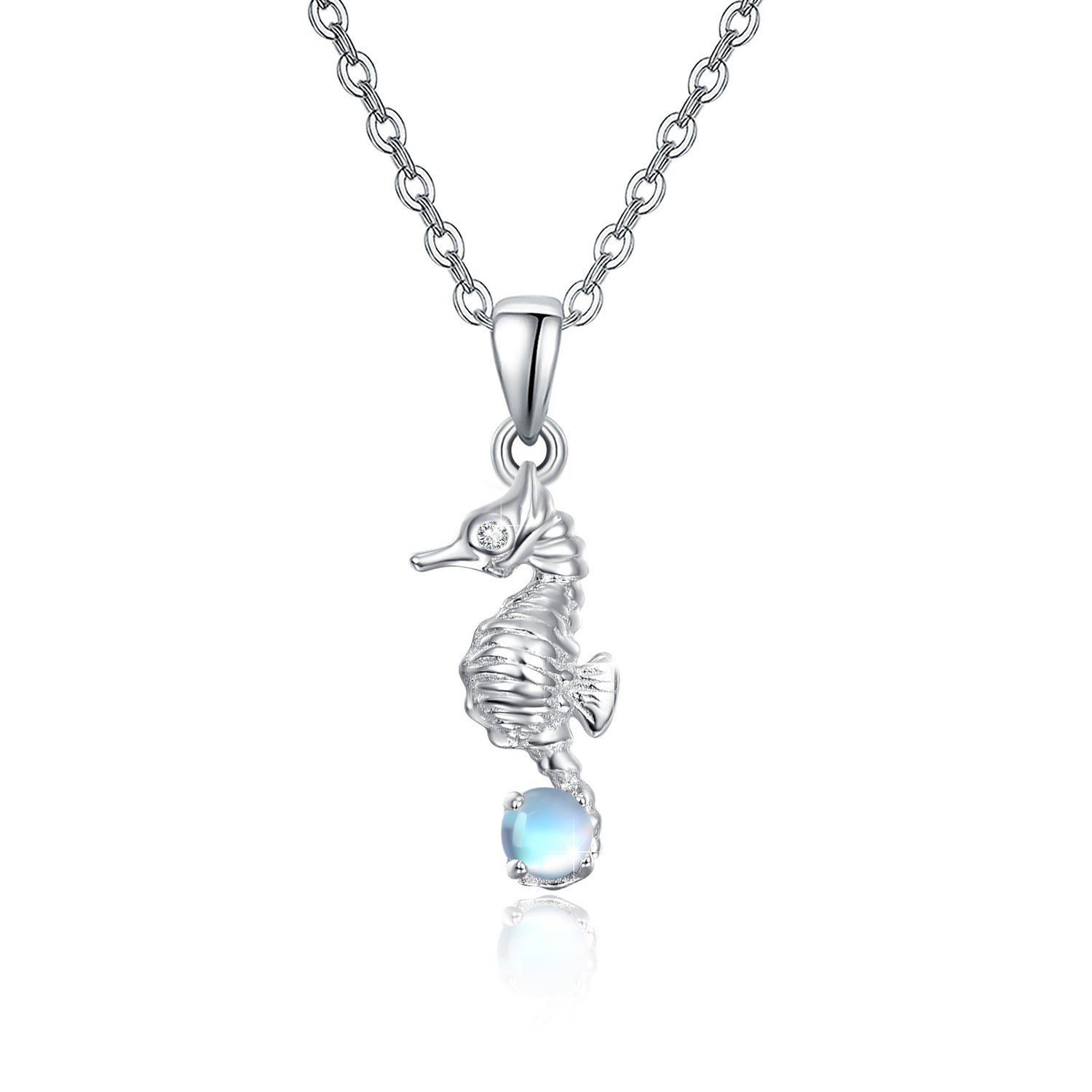Sterling silver; white gold plating; moonstone; seahorse motif; cable chain necklace.