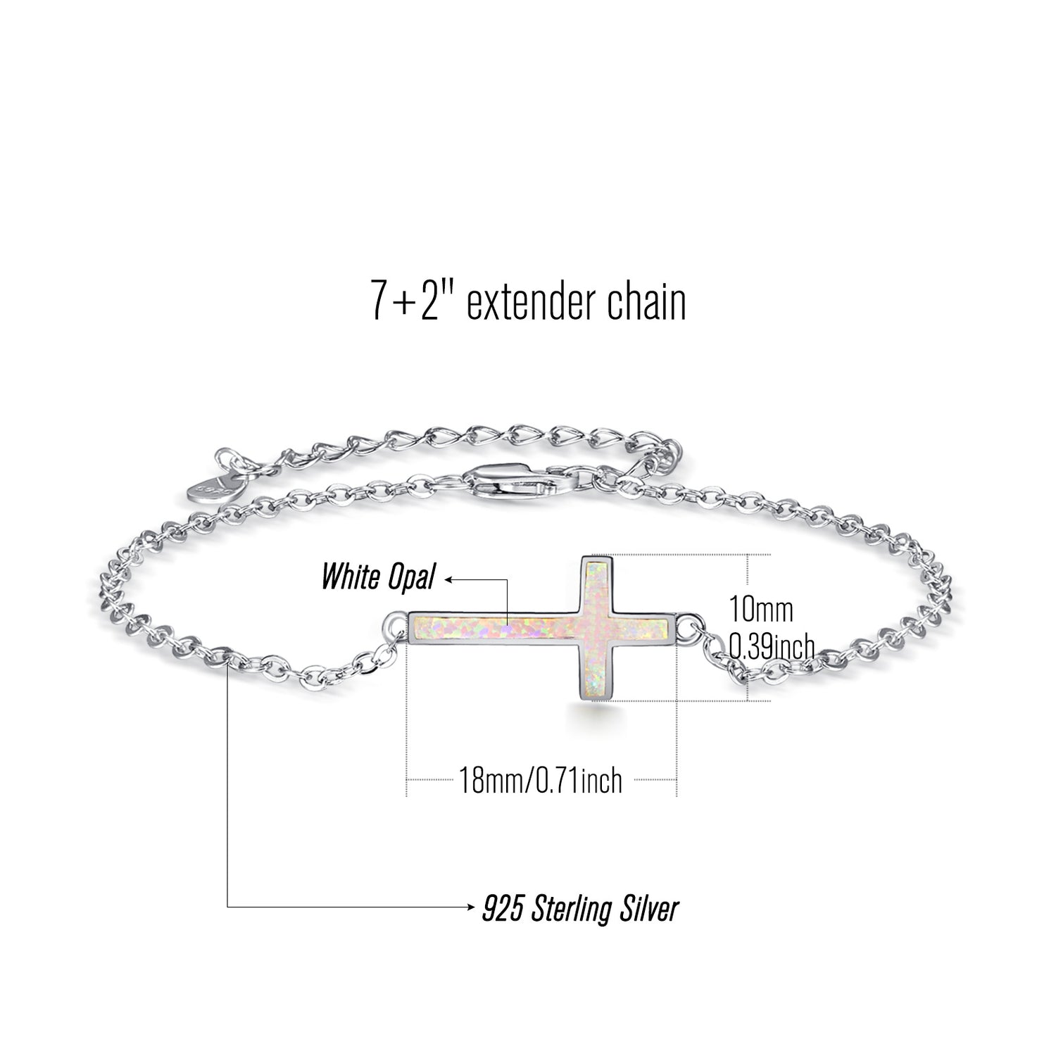 This charm bracelet is crafted from Solid 925 Sterling Silver, finished with a White Gold Plating, and features an Opal Cross Charm.