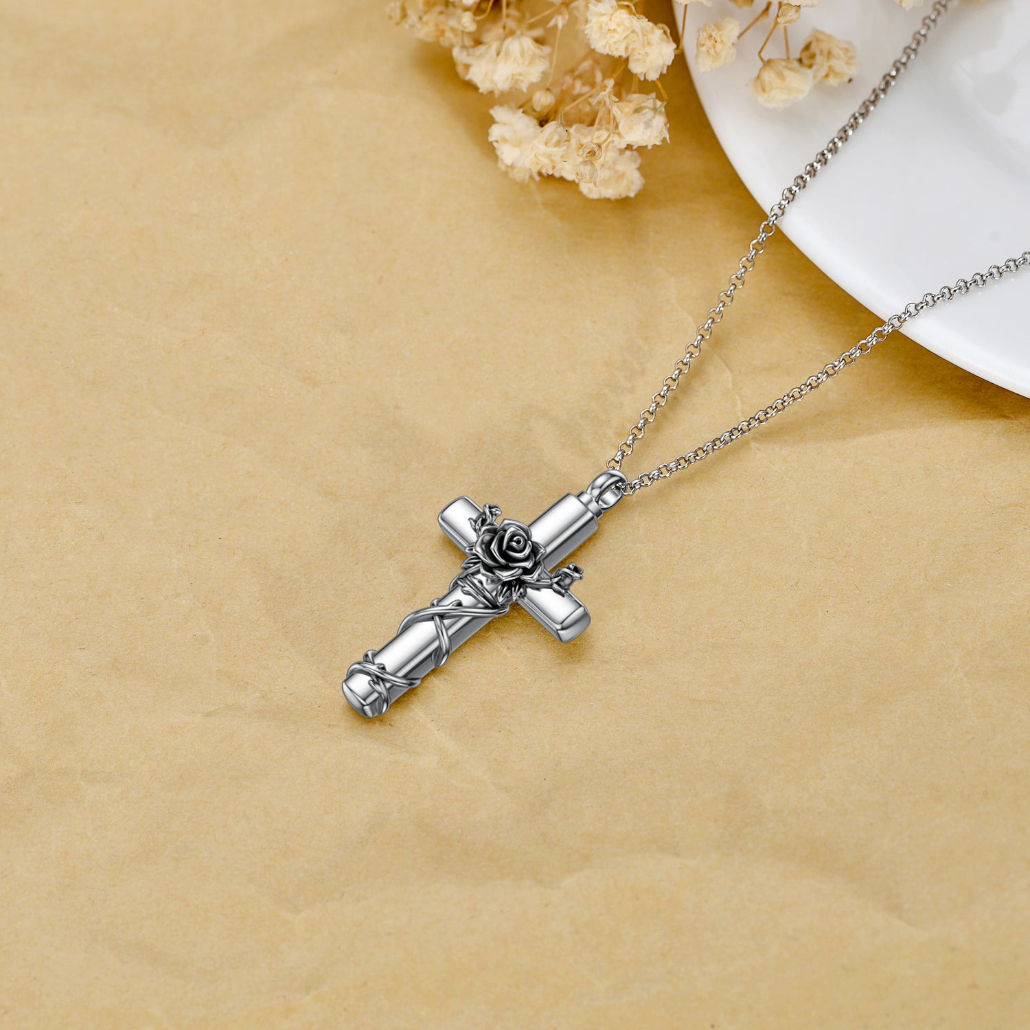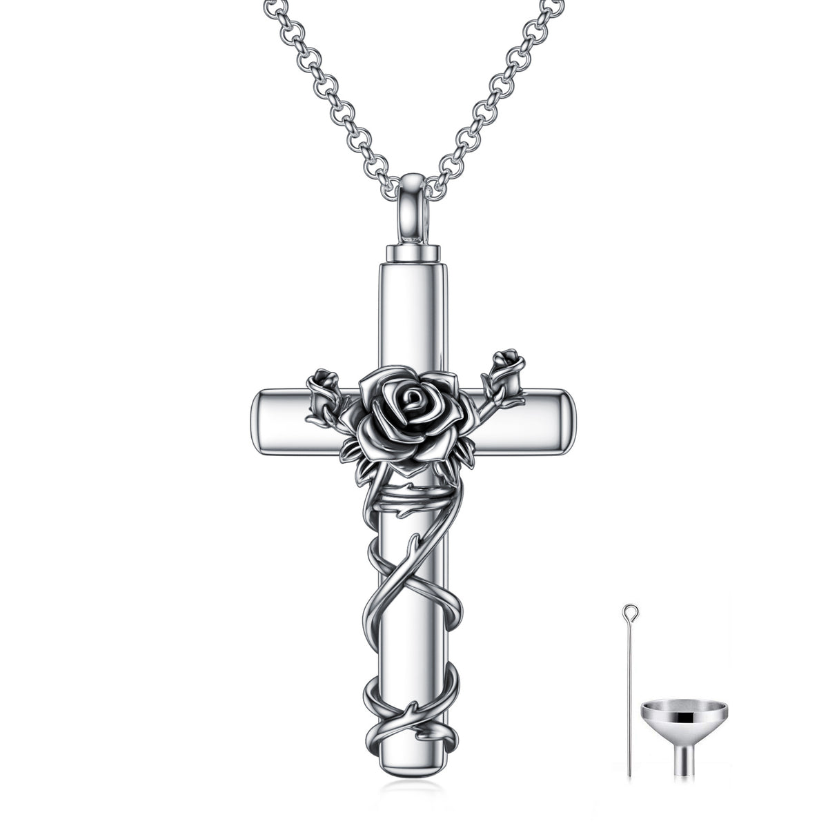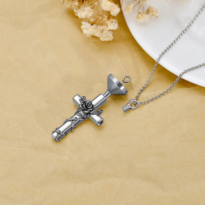 Sterling Silver Vintage Rose & Cross Urn Necklace for Ashes