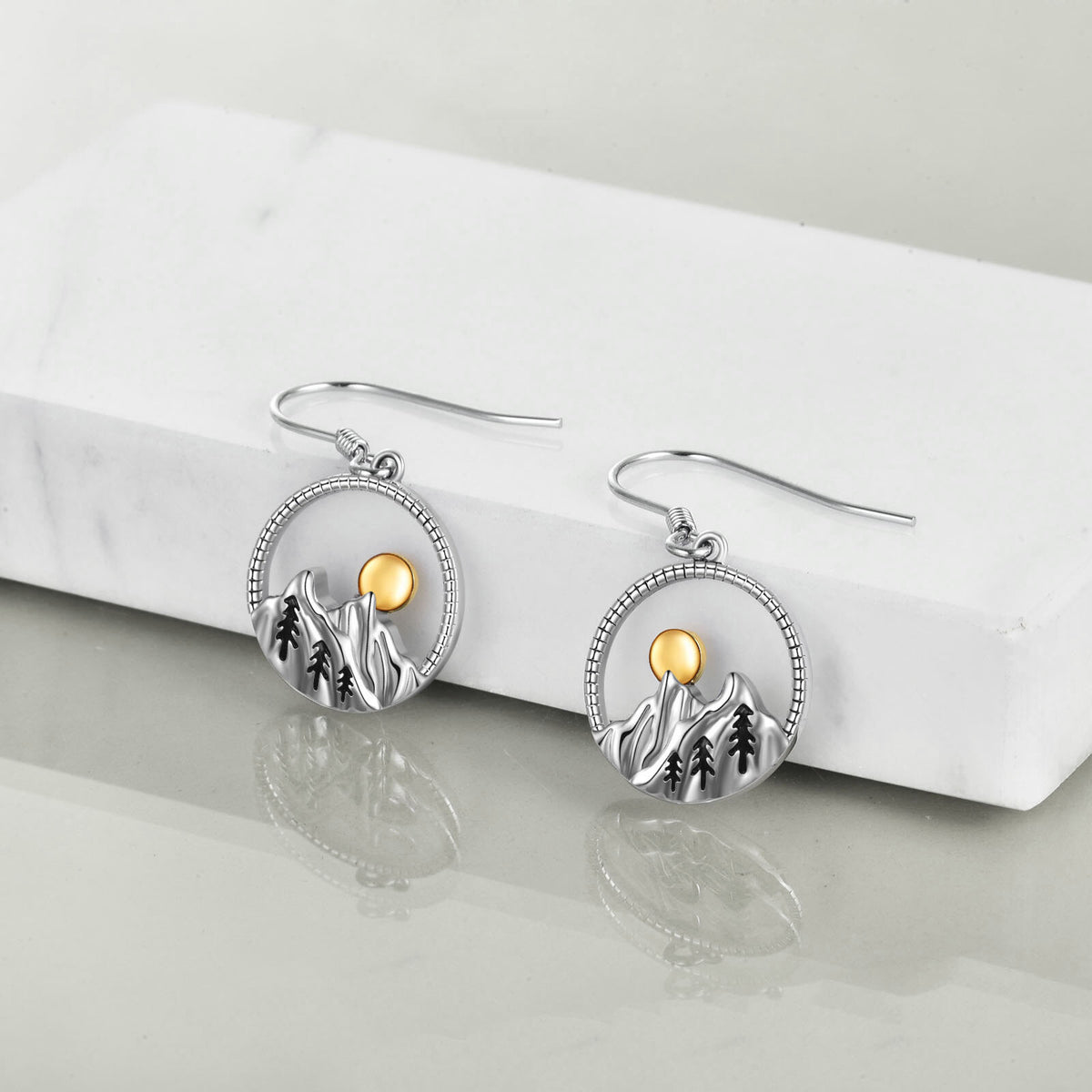 Sterling silver. White gold & yellow gold plating. Mountains & sun motif. Drop earring design.