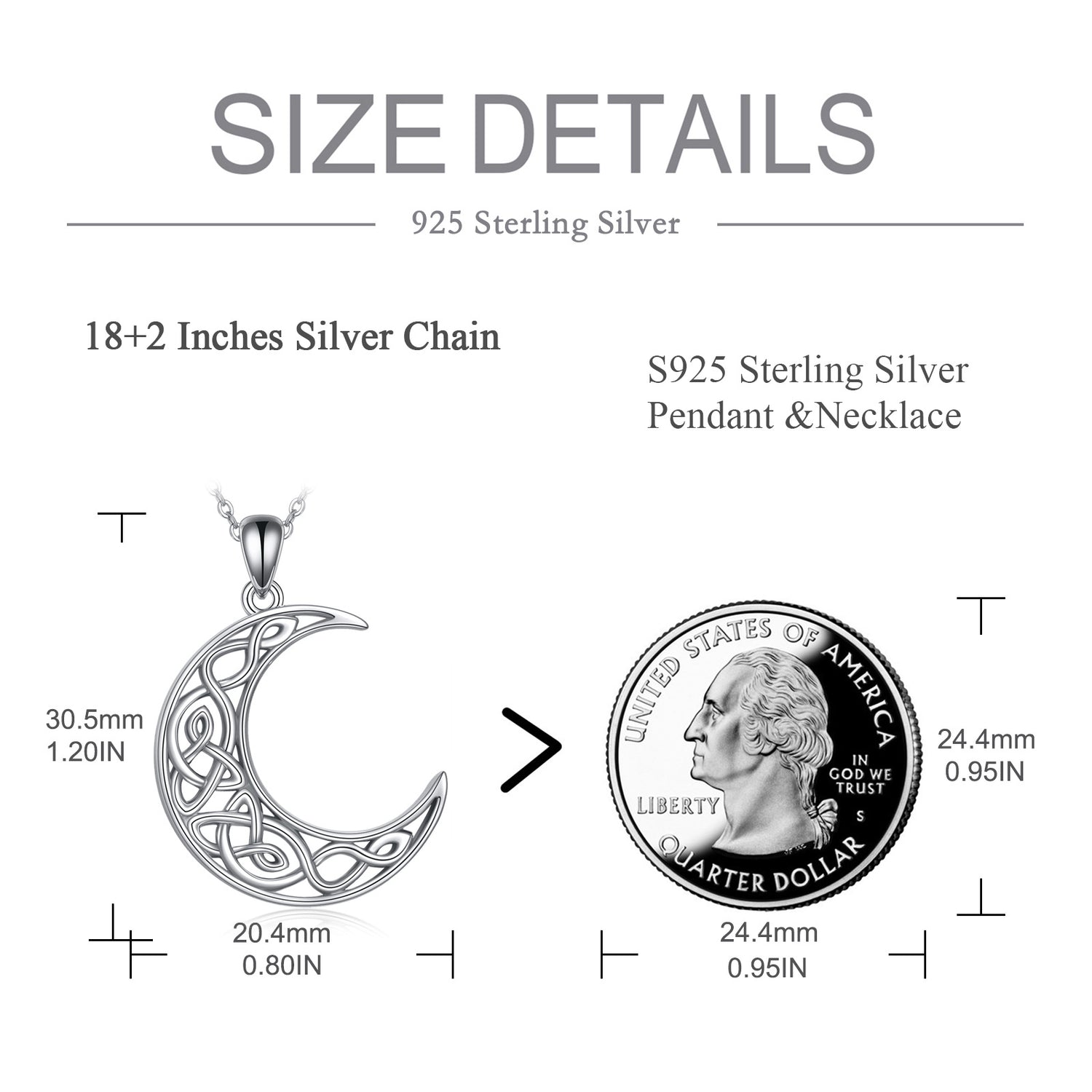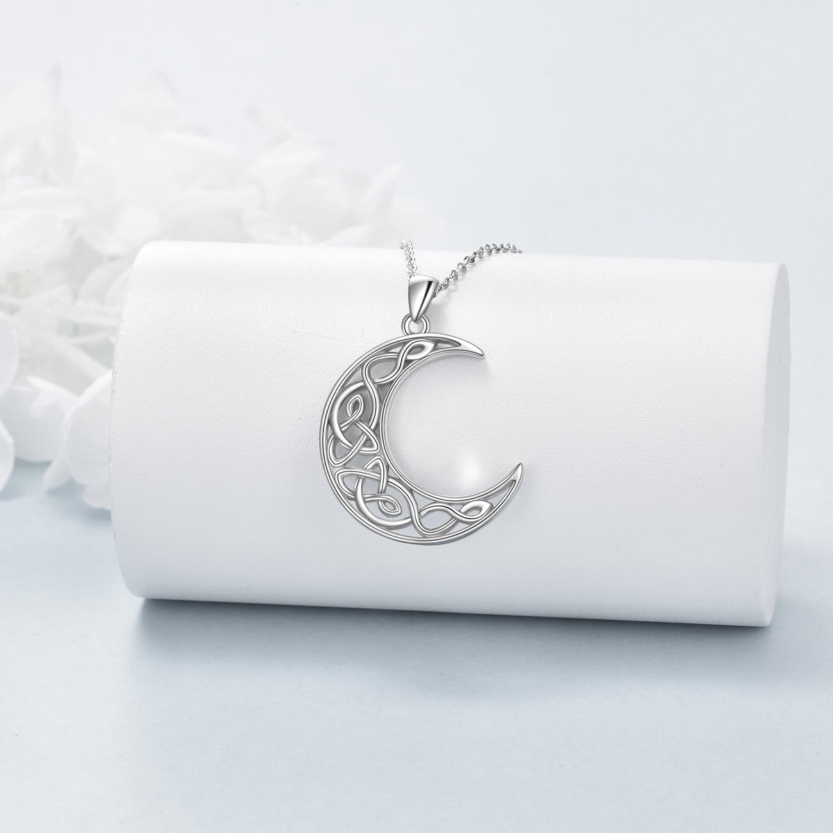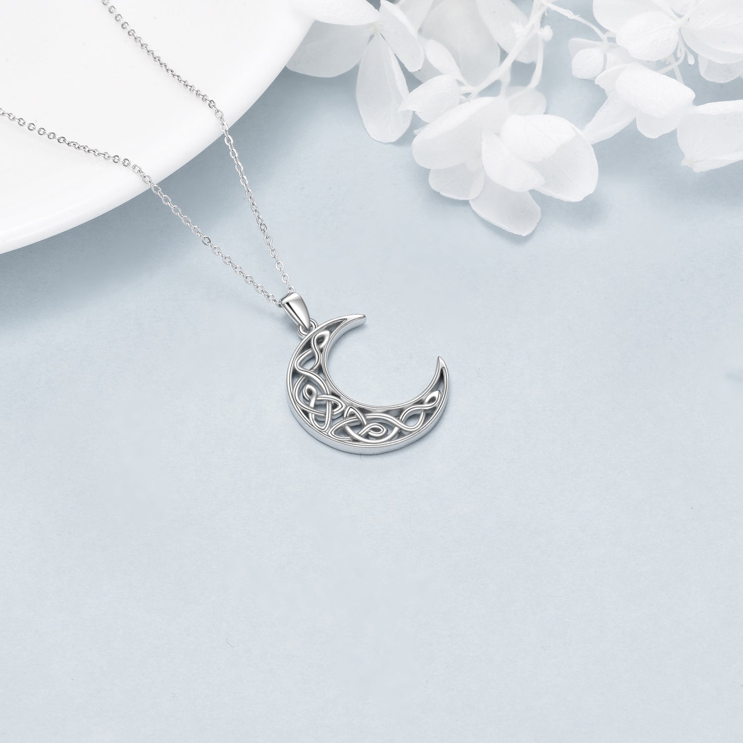 This Pendant Necklace is crafted from Premium Sterling Silver with White Gold Plating, showcasing a Celtic Knot and Moon Motif.