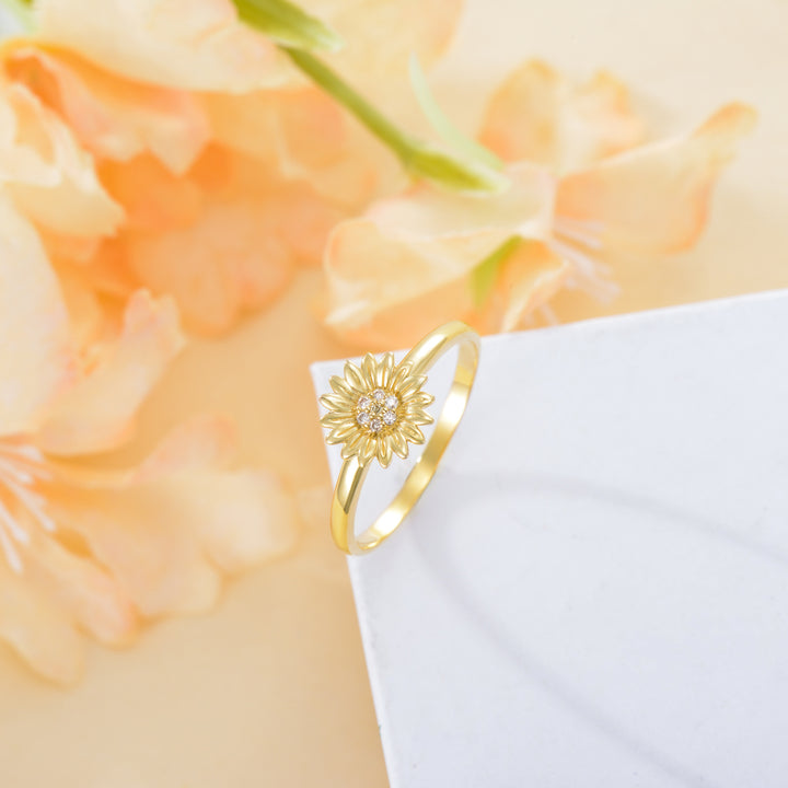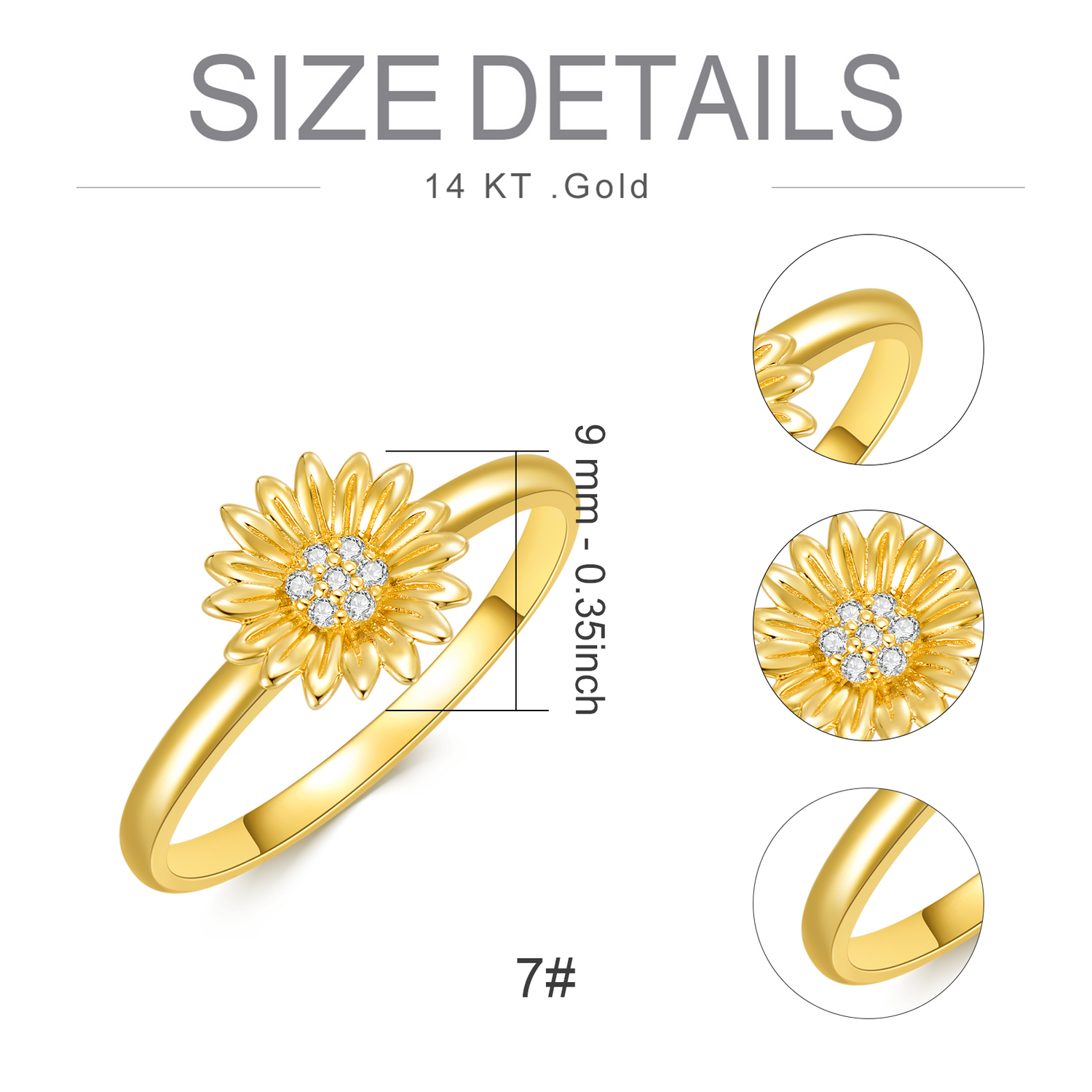 This 14K Gold Round Moissanite Sunflower Ring by YFN is a stunning testament to refined craftsmanship for women. This dazzling 14K Gold ring features a round, clear Moissanite gemstone that sparkles with unparalleled brilliance, set to highlight its exquisite Sunflower design.