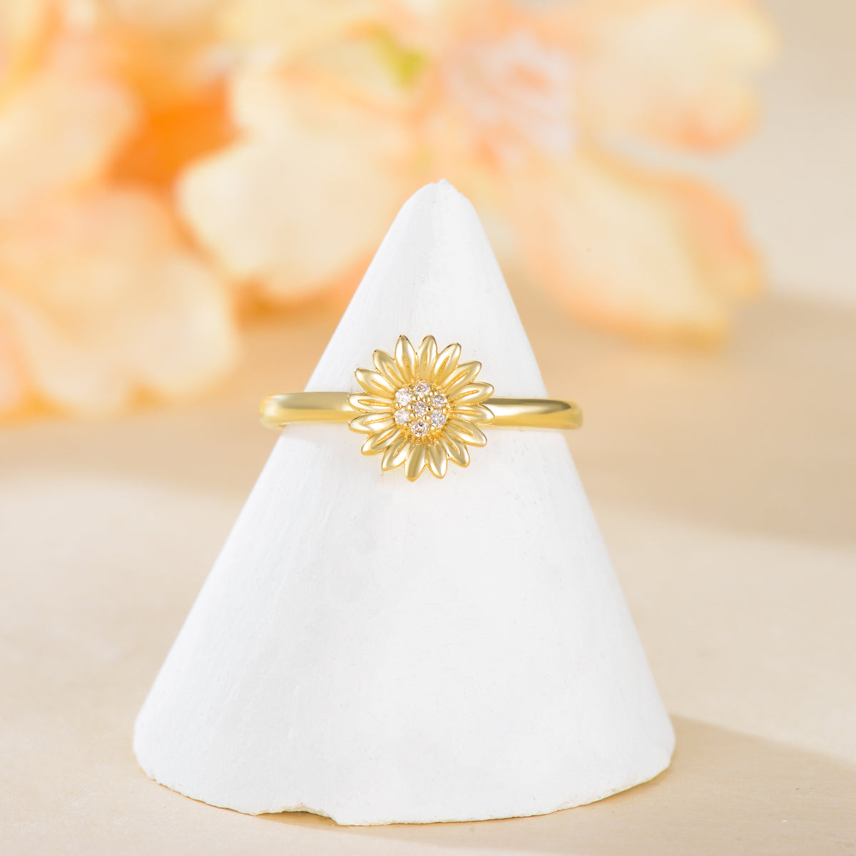 This Sunflower Ring is crafted from 14K Gold, Featuring a Round, Clear Moissanite Gemstone.