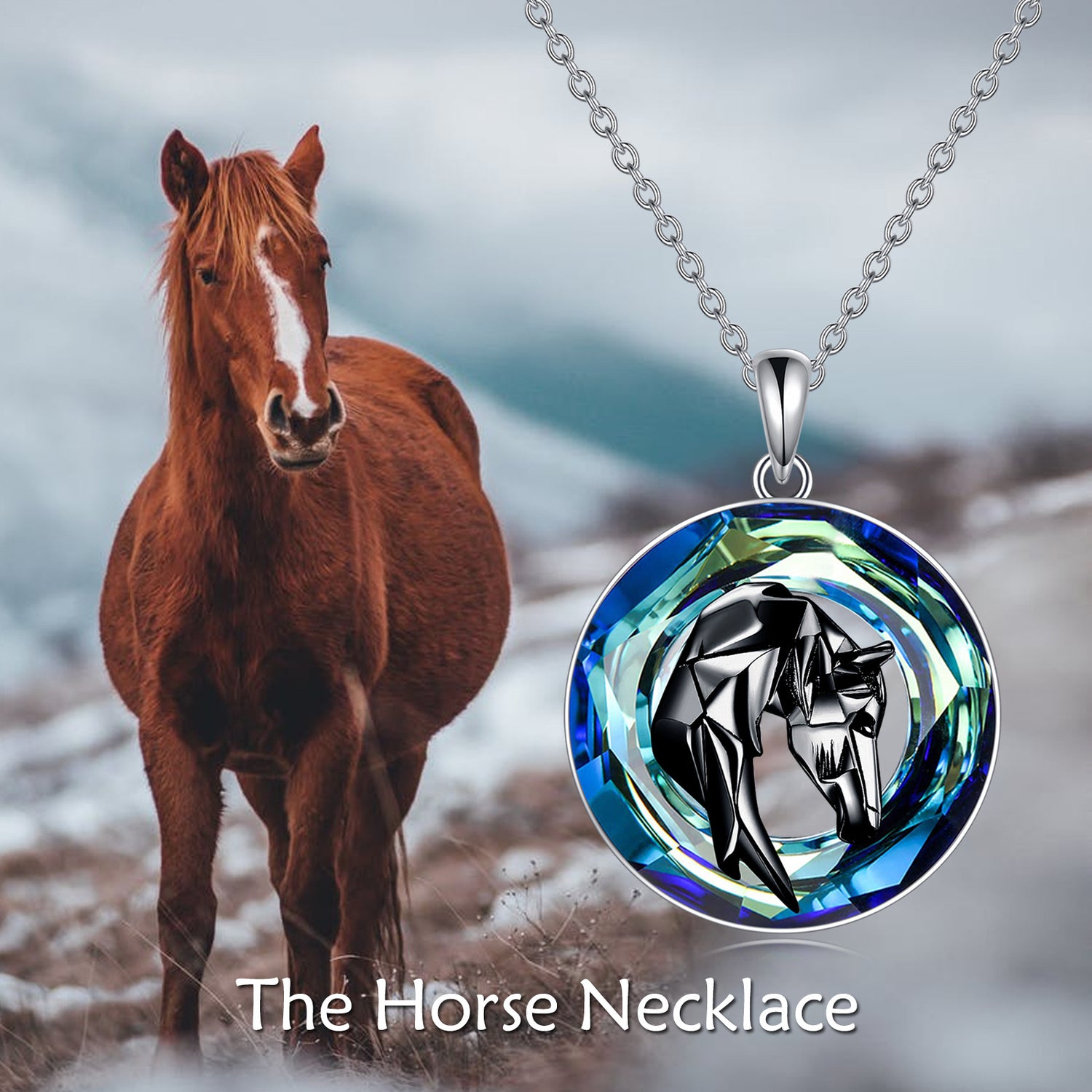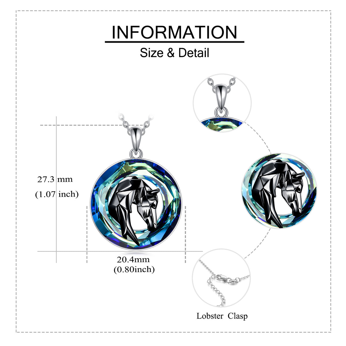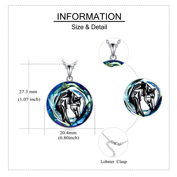 Crafted from Sterling Silver with Silver and Black Tones (Two-Tone). This is a Round Pendant Necklace featuring a Horse motif, set with a Blue Crystal stone.
