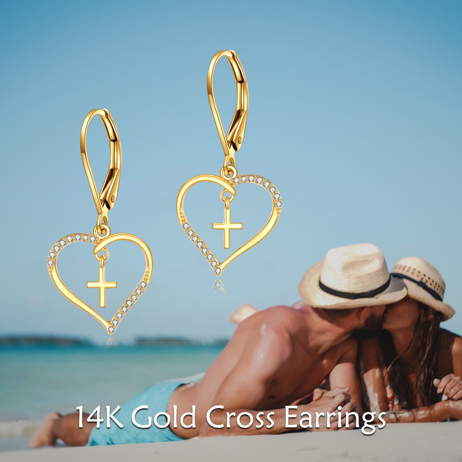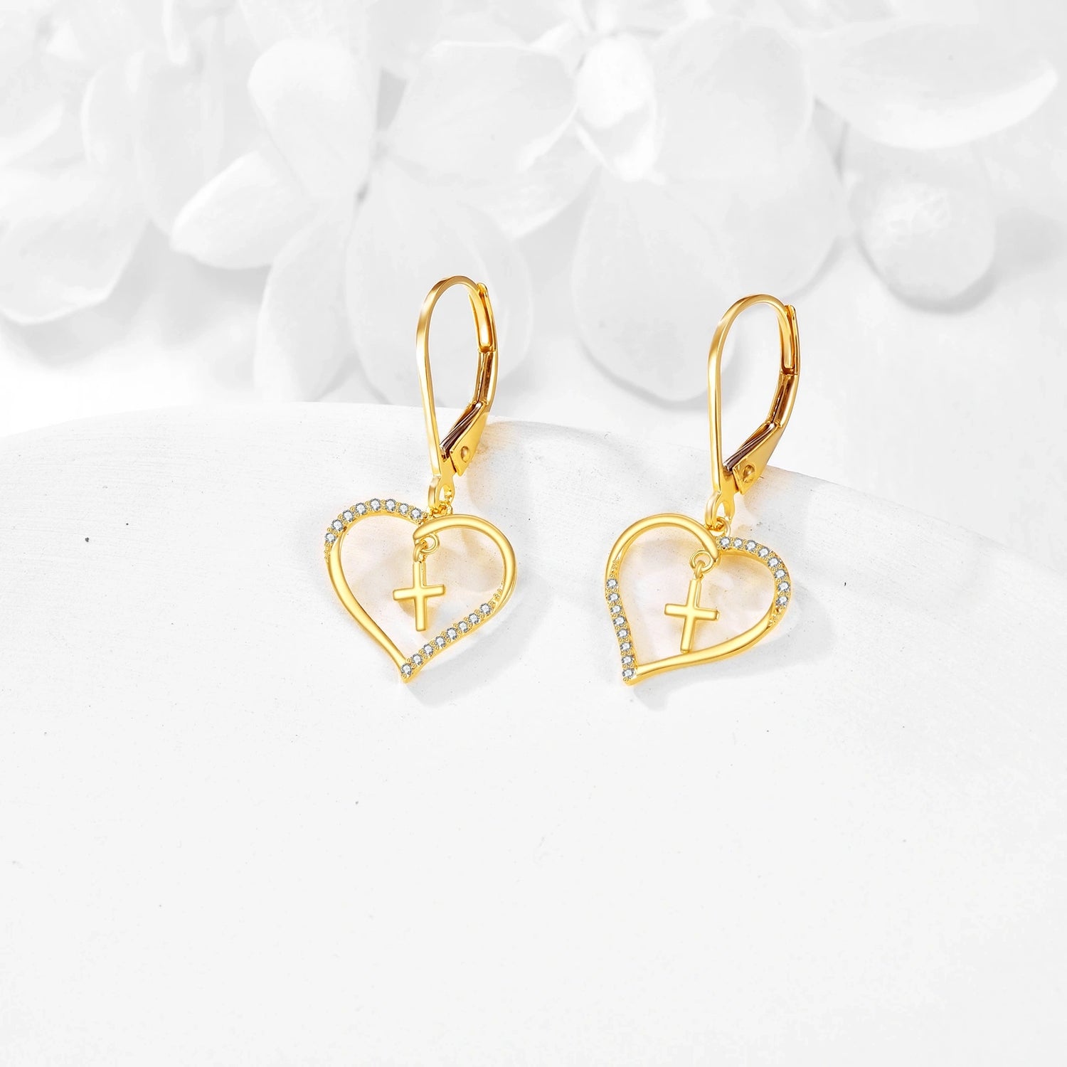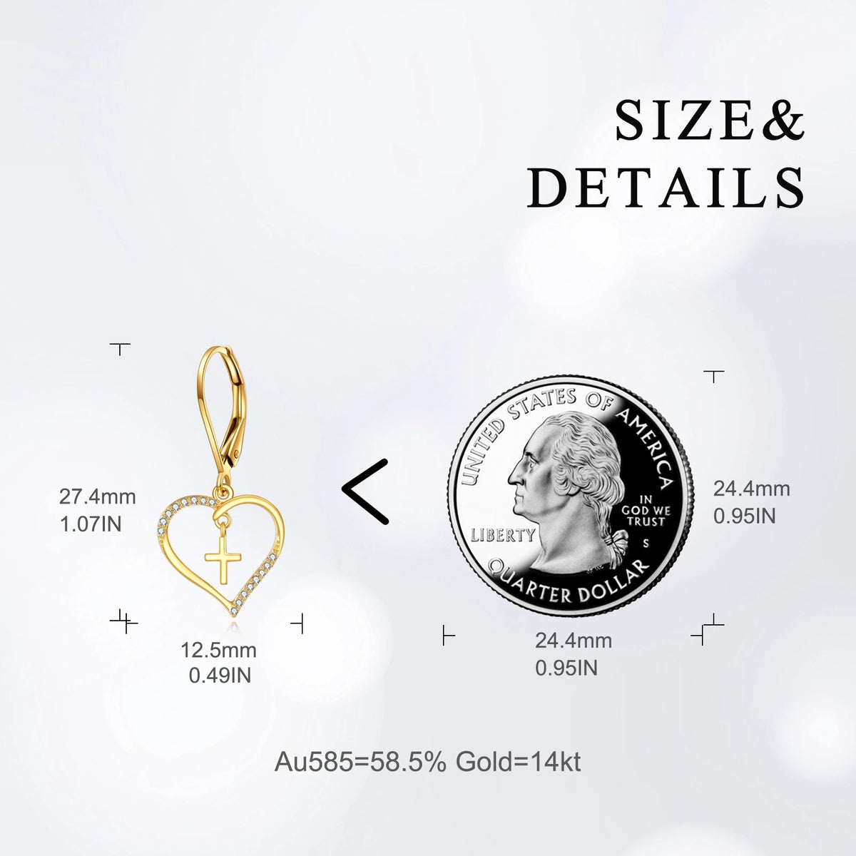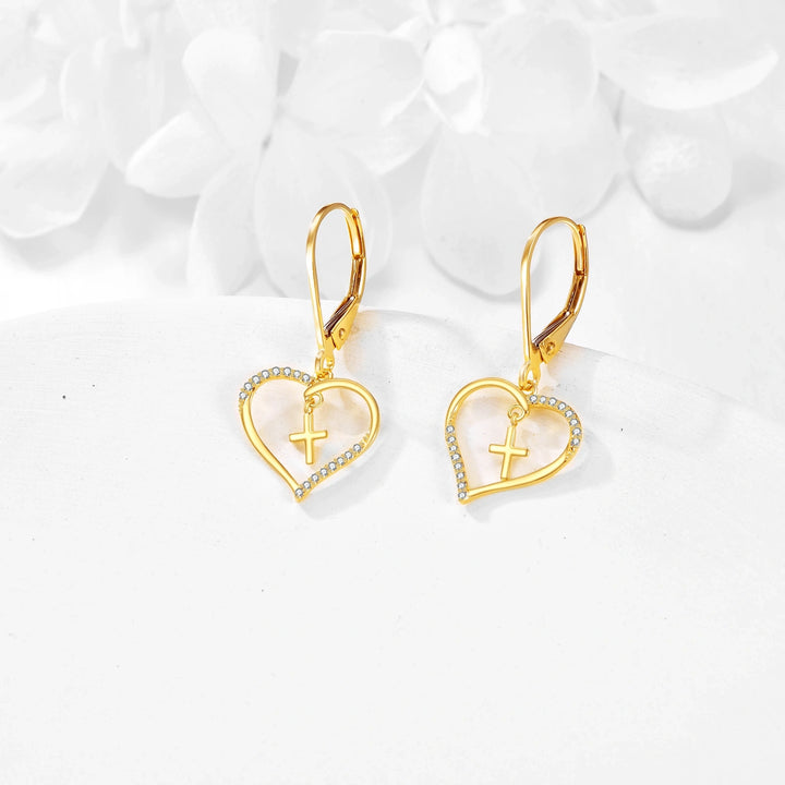 14K Yellow Gold Circular Cubic Zirconia Cross & Heart Lever-back Earrings