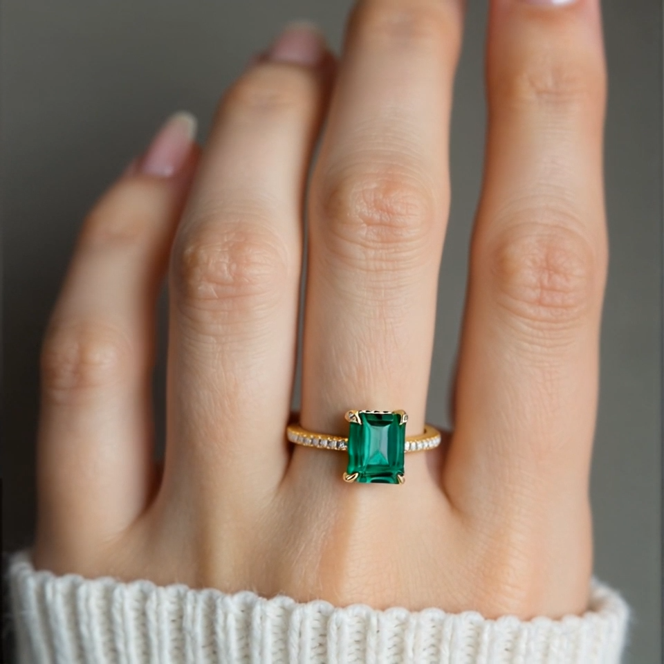 This Emerald Lab Created Diamond & Lab Created Emerald Engagement Ring by YFN is a stunning symbol of luxury and commitment for couples. Crafted in 18K Gold, this ring features a breathtaking large center stone (2 to 7 CT T.W.) made of lab-created emerald or diamond. The diamond option is graded D color and VVS1-VS1 clarity. With exceptional 3EX polish/cut/symmetry, this piece embodies timeless elegance and sophistication for women.