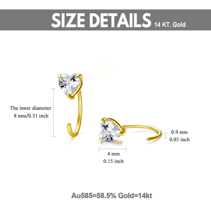 Crafted in 14K gold with clear cubic zirconia stones, featuring heart-shaped hoop construction. Earring dimensions and closure details provided by the brand.