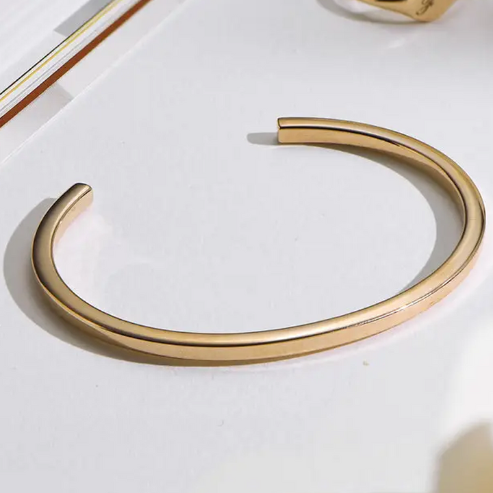 Crafted from 925 sterling silver with yellow gold plating (vermeil). Features a stone-free plain bangle bracelet design. Customizable with personalized engraving (name, nickname, or zodiac sign).