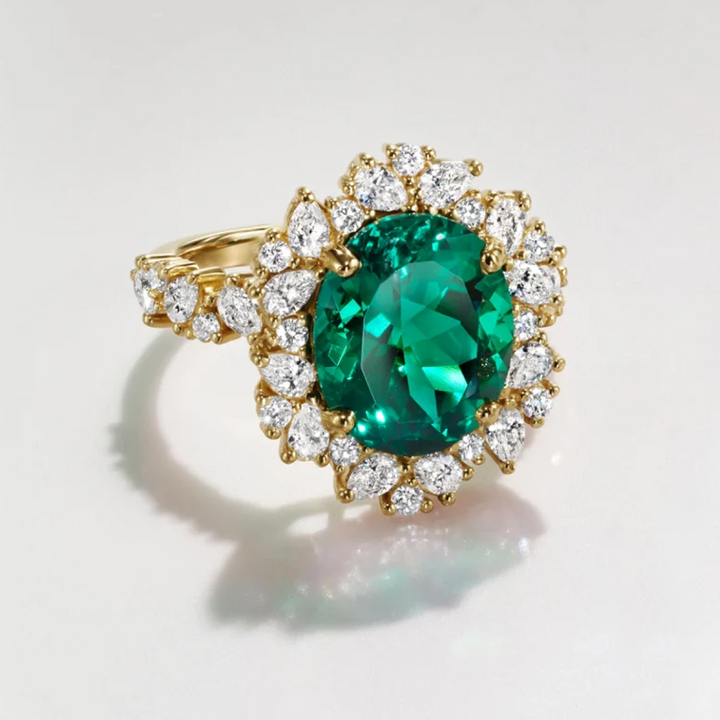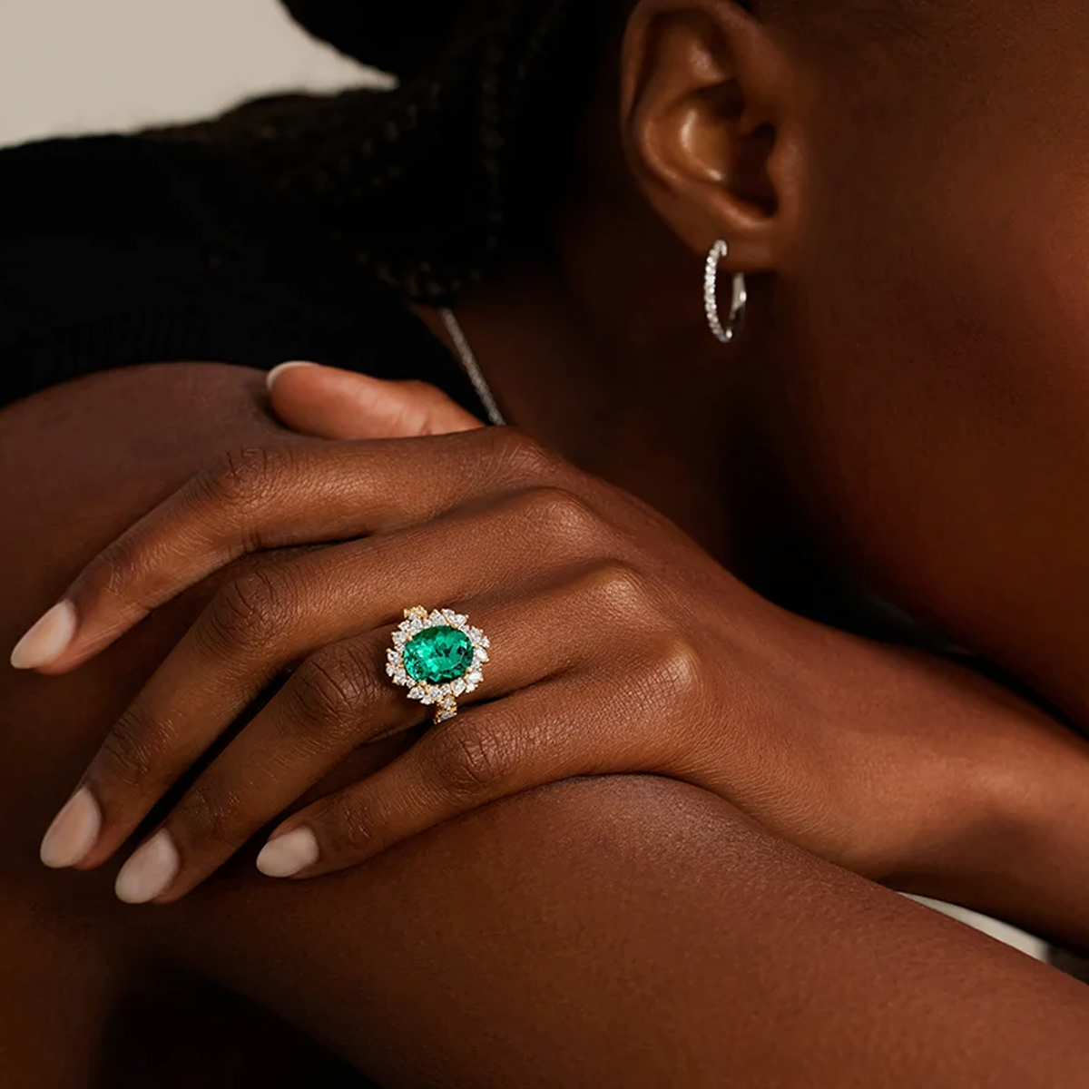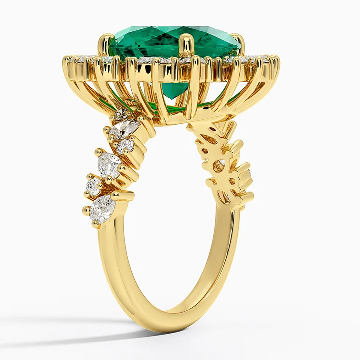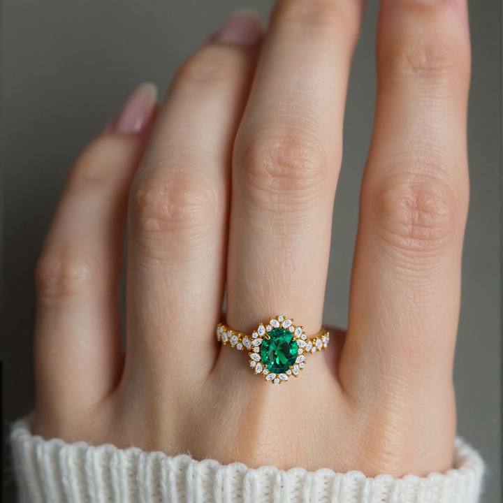 This Oval Cut Lab Created Emerald Engagement Ring by YFN beautifully symbolizes a unique love story. Crafted in exquisite 18K Gold, this ring features an elegant oval cut lab-created emerald center stone (2 to 7 CT), surrounded by a halo of wildflower-inspired design. With personalized engraving options, the ring boasts D diamond color and expert EX polish, cut, and symmetry, making it a breathtaking, sophisticated piece for women.