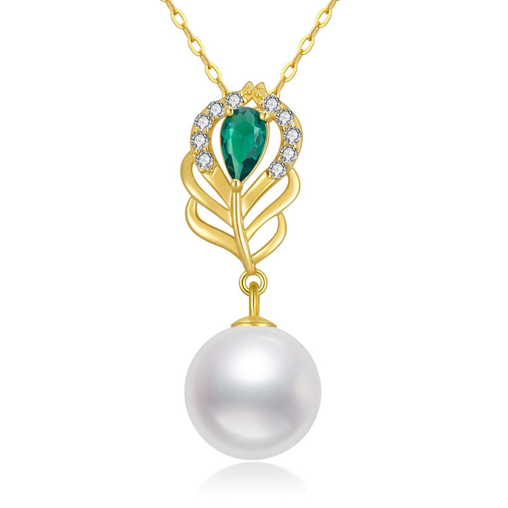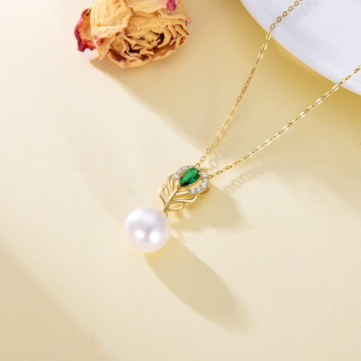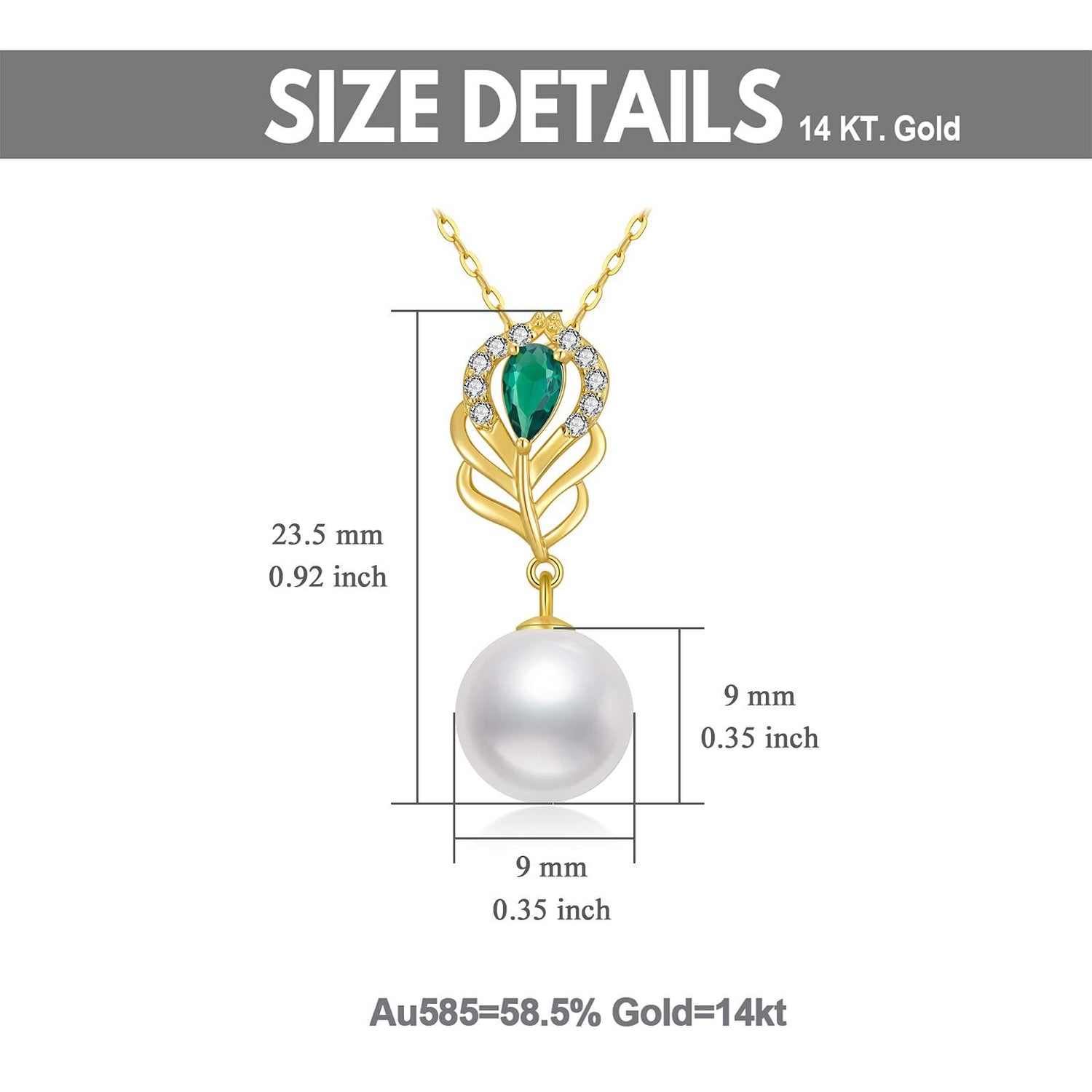 14K Gold Circular Shaped Pearl Bead & Peacock Feather Pendant Necklace
