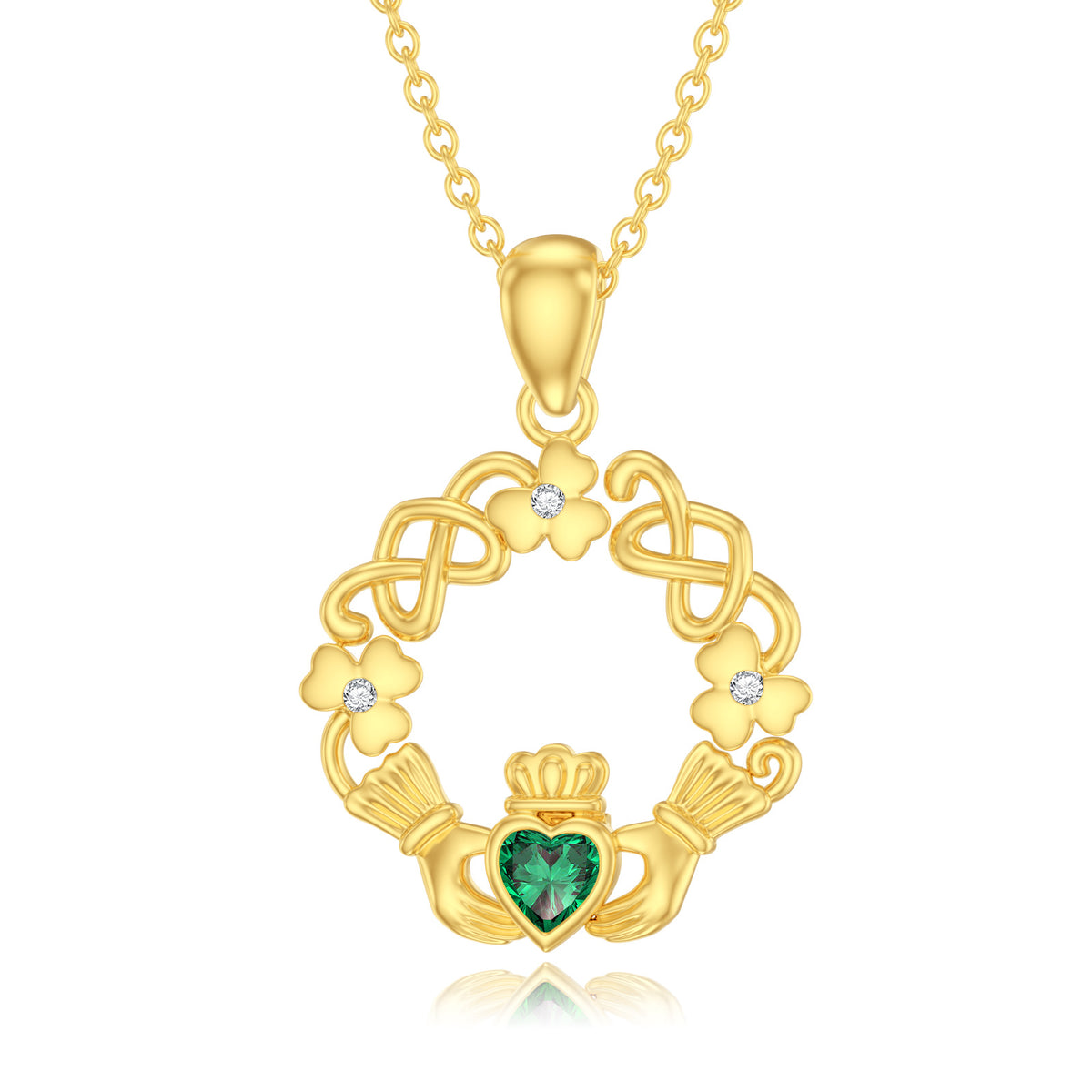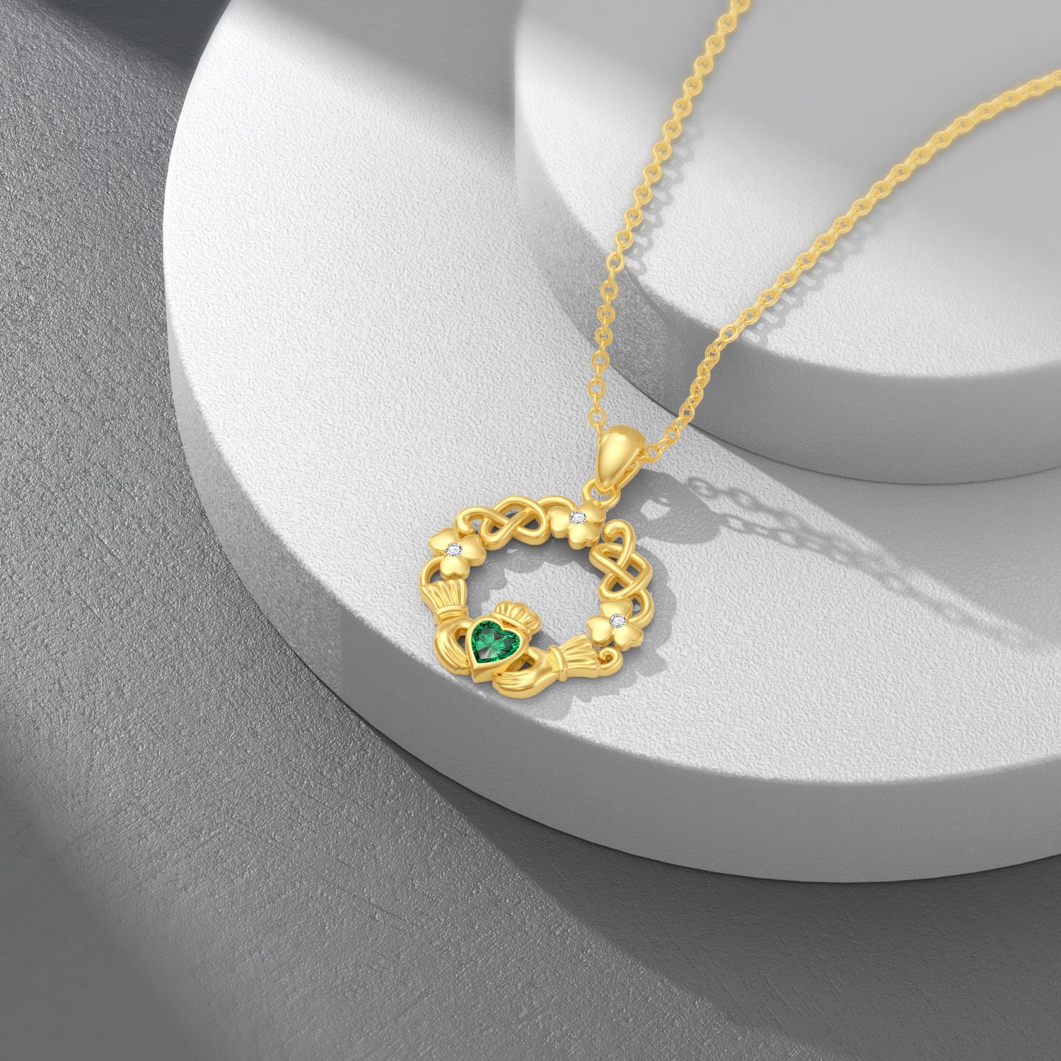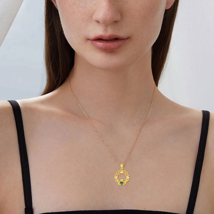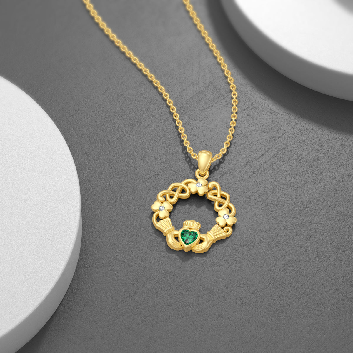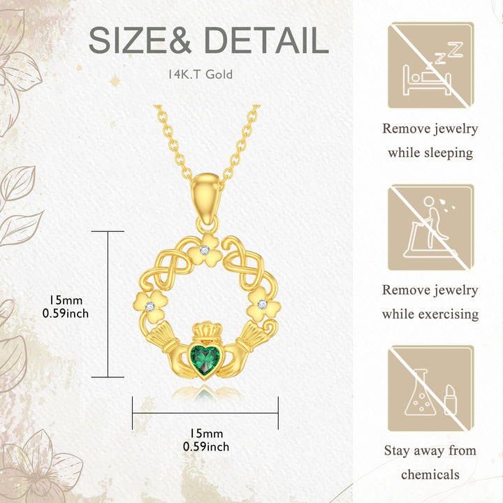 This Women's Pendant Necklace is crafted from High-Quality 14K Gold, featuring a Four Leaf Clover and Claddagh Design Adorned with Green Cubic Zirconia Stones.