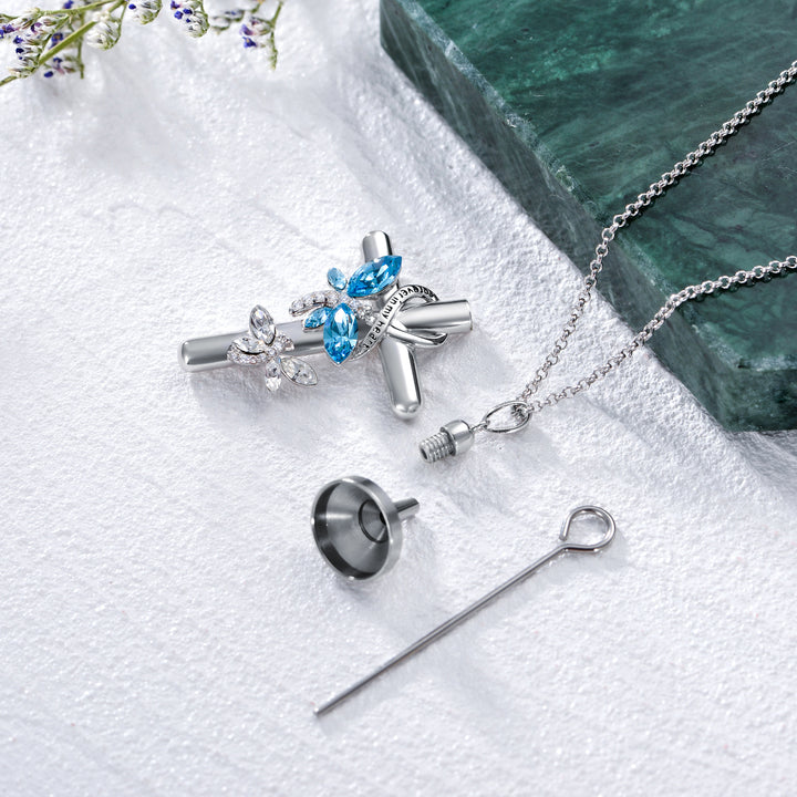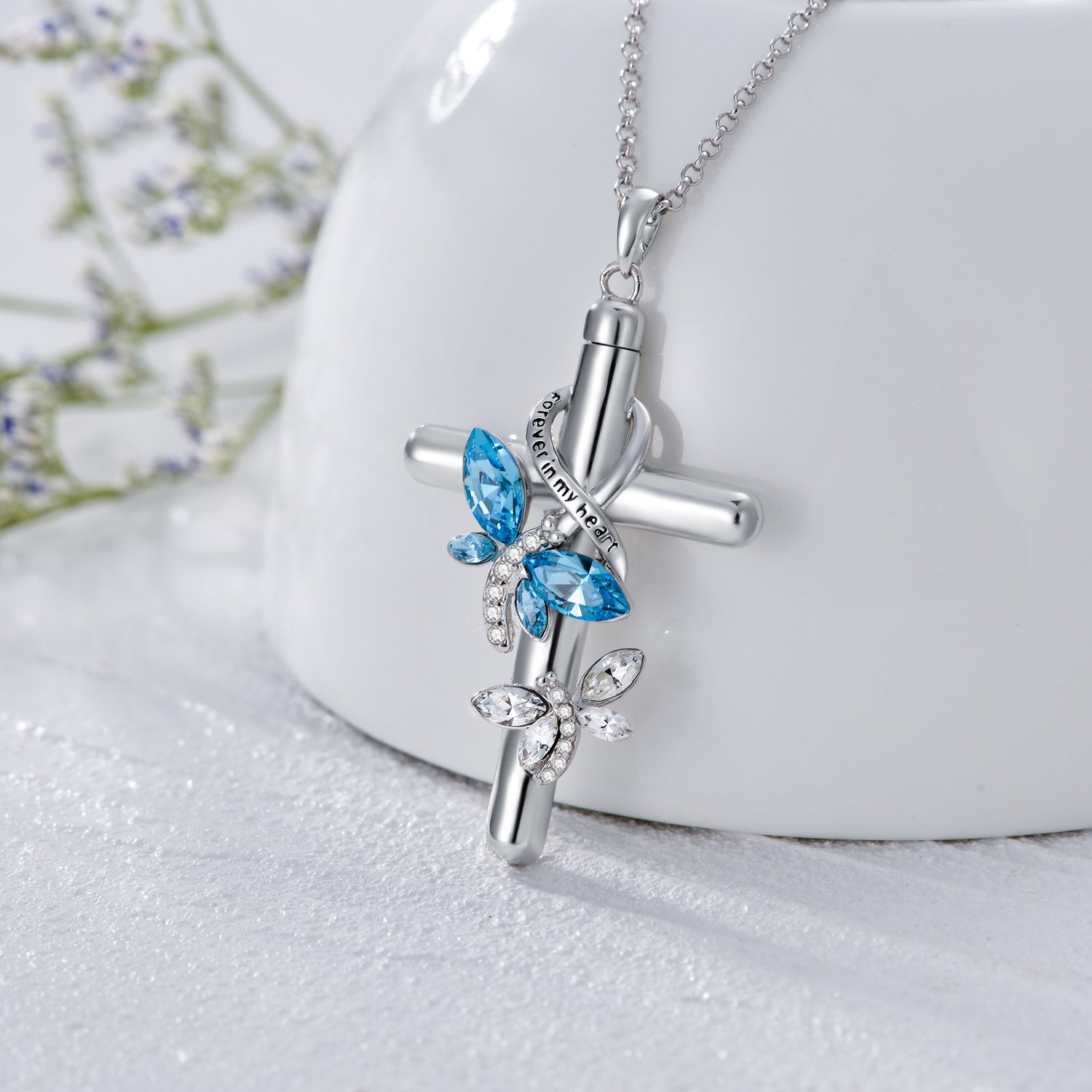 This Sterling Silver Purple Crystal Butterfly With Cross With Infinity Symbol Urn Necklace by YFN is a sentimental and elegant memorial piece. The urn pendant, featuring delicate purple crystals and motifs like the butterfly, cross, or infinity symbol, is white gold plated. The "Forever In My Heart" engraving gives it a profound, cherished aesthetic, perfect for keeping a loved one's memory close with grace and lasting beauty.
