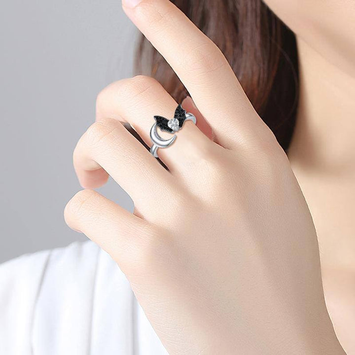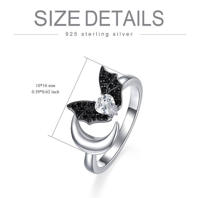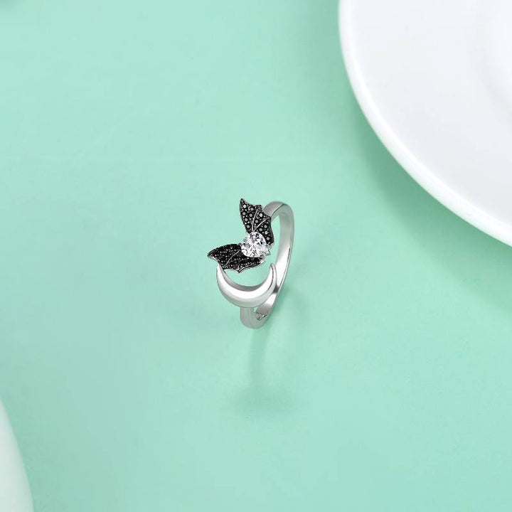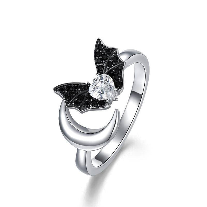 This Open Ring is crafted from High-Quality Sterling Silver with White Gold Plating, Featuring Clear Cubic Zirconia in a Captivating Bat and Moon Motif.