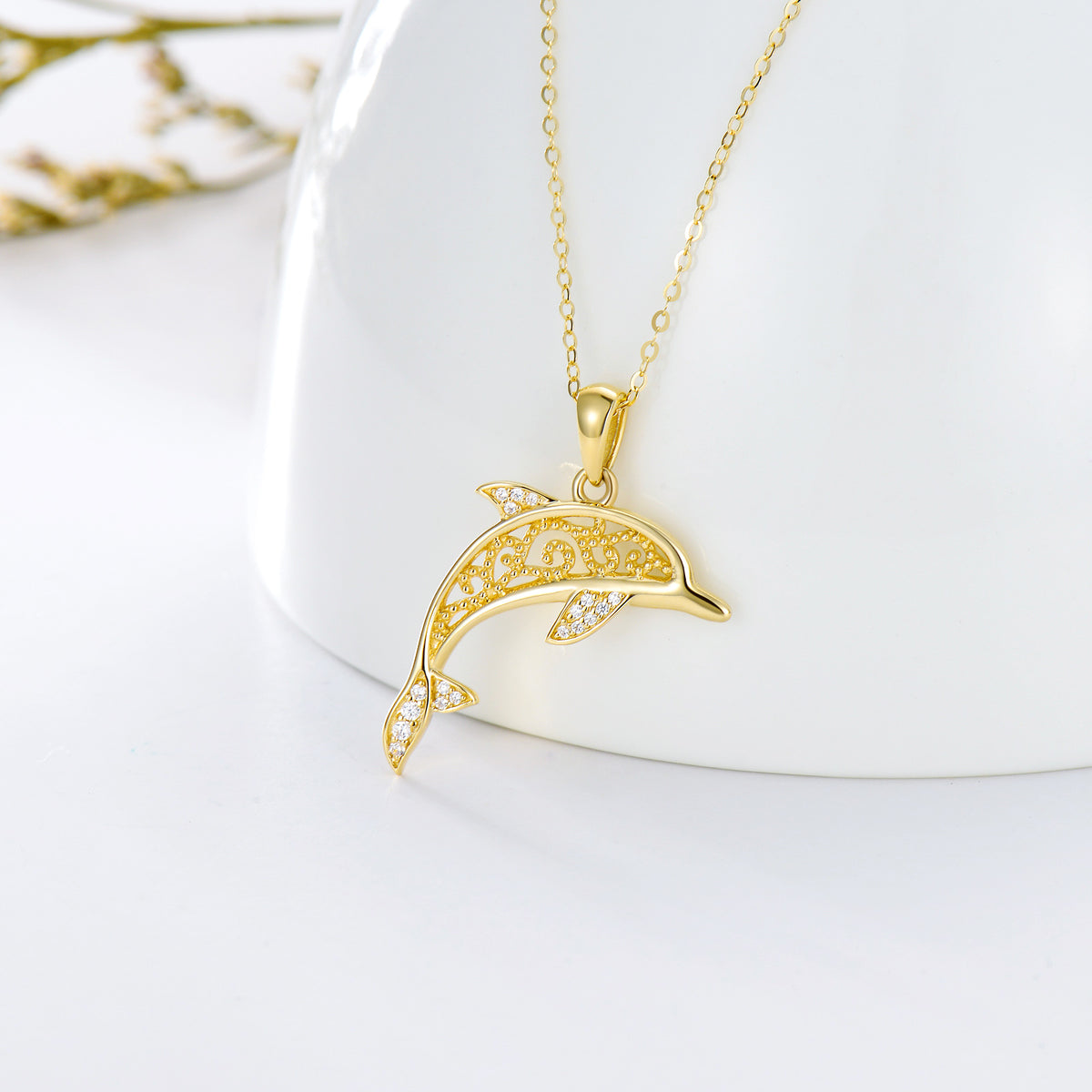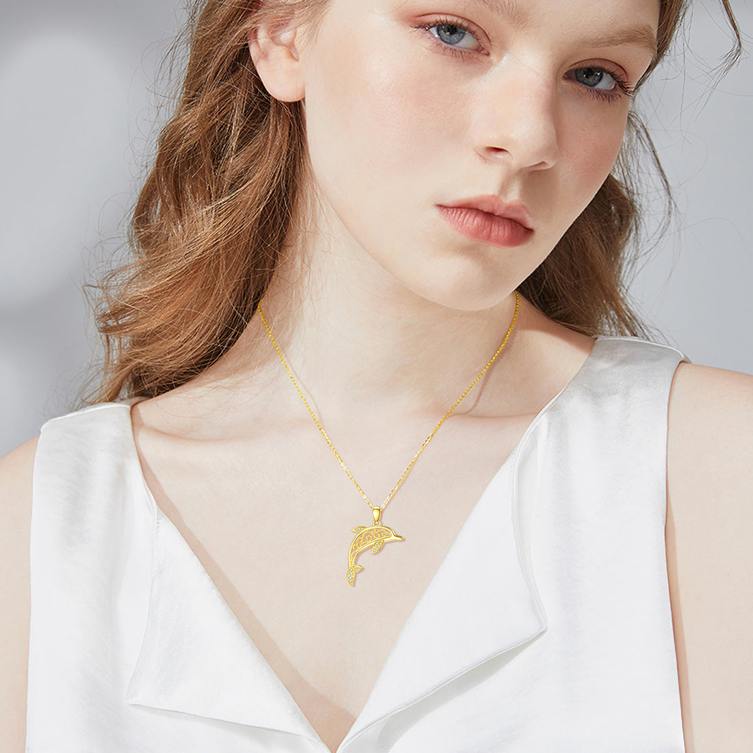 This 14K Gold Cubic Zirconia Dolphin Pendant Necklace by YFN captures the joyful spirit and fluid elegance of the dolphin, a symbol of harmony, playfulness, and emotional freedom. The radiant cubic zirconia accent sparkles with every movement, enhancing the graceful curves of the gold-crafted dolphin. Designed for women who appreciate expressive yet sophisticated jewelry, this pendant adds a touch of brilliance to both everyday outfits and special occasions. Its meticulous craftsmanship and luminous finish make it a standout piece that beautifully balances whimsy with refined luxury.