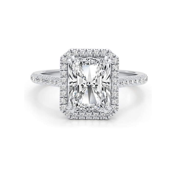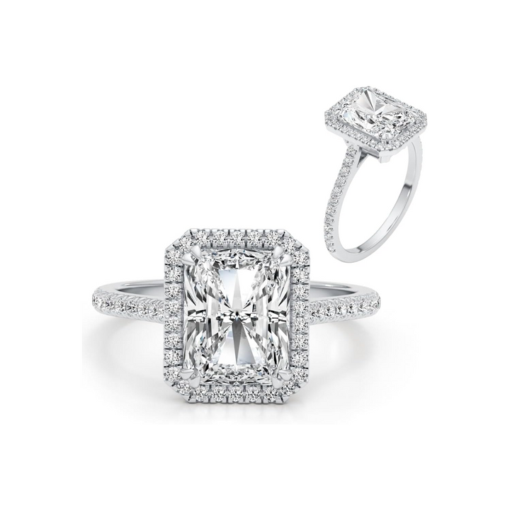 Engagement ring crafted from solid 14K white gold, halo style, princess cut. Features one lab-created diamond center stone (3 CT). D color, VVS1-VS1 clarity. 3EX cut. IGI Certified. Available in standard US ring sizes 5 to 10.