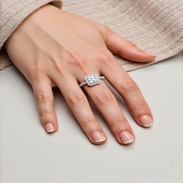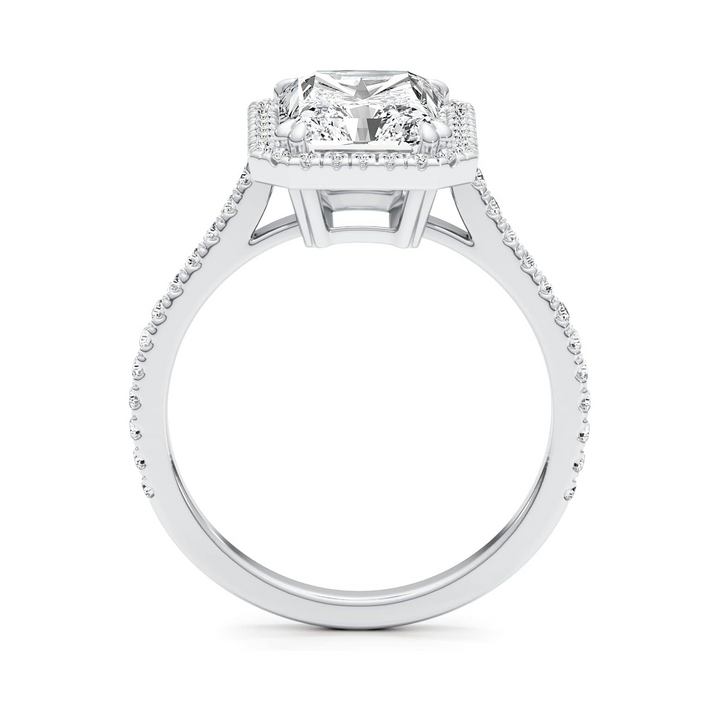This Princess Cut Lab Created Diamond Custom Engagement Ring by YFN is a perfect symbol of love for couples. Set in luxurious 14K White Gold, this halo-style ring features a remarkable 3 CT Princess cut lab-created diamond center stone (D color, VVS1-VS1 clarity). Exceptional cut, symmetry, and polish guarantee a timeless, brilliant elegance.