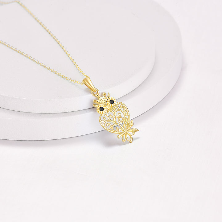 Crafted from solid 14K Gold. This is a Pendant Necklace featuring a Black Owl centerpiece and adorned with Zircon stones.