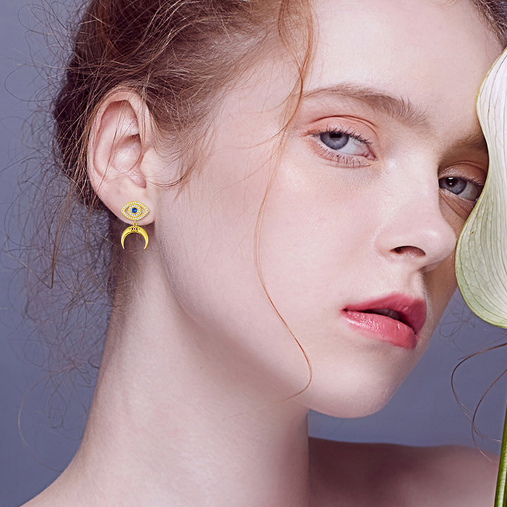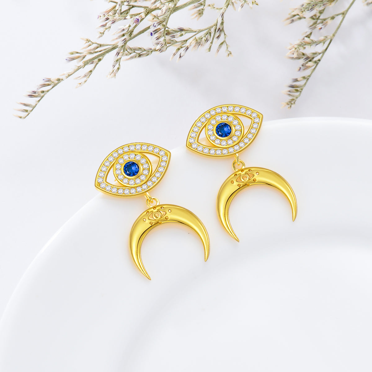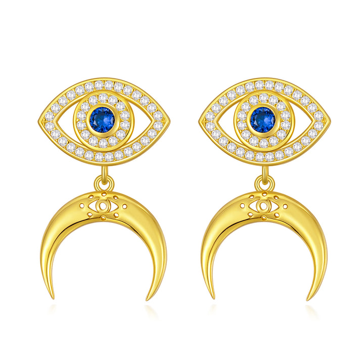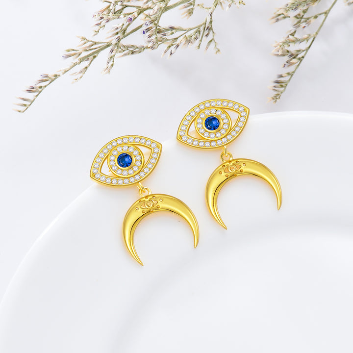Crafted in sterling silver with yellow gold vermeil plating. Features circular evil eye and moon motifs with blue cubic zirconia accents. Drop-style earrings with secure hooks.
