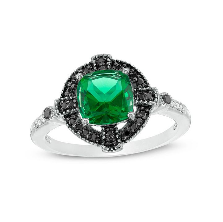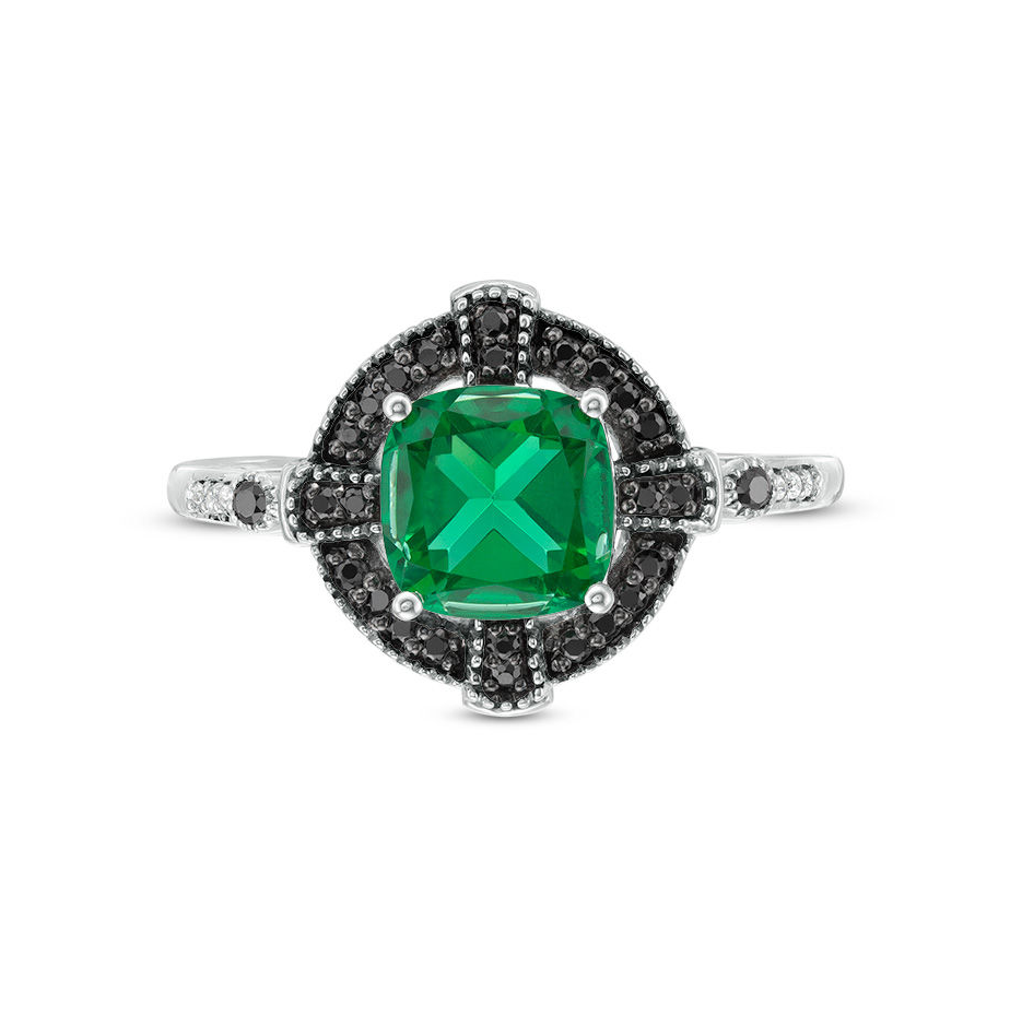 Crafted from 10K white gold, featuring a central cushion cut lab-created emerald (size unspecified) and 0.15 CT.T.W. of lab-created black and J-color white diamonds (I3 clarity).
