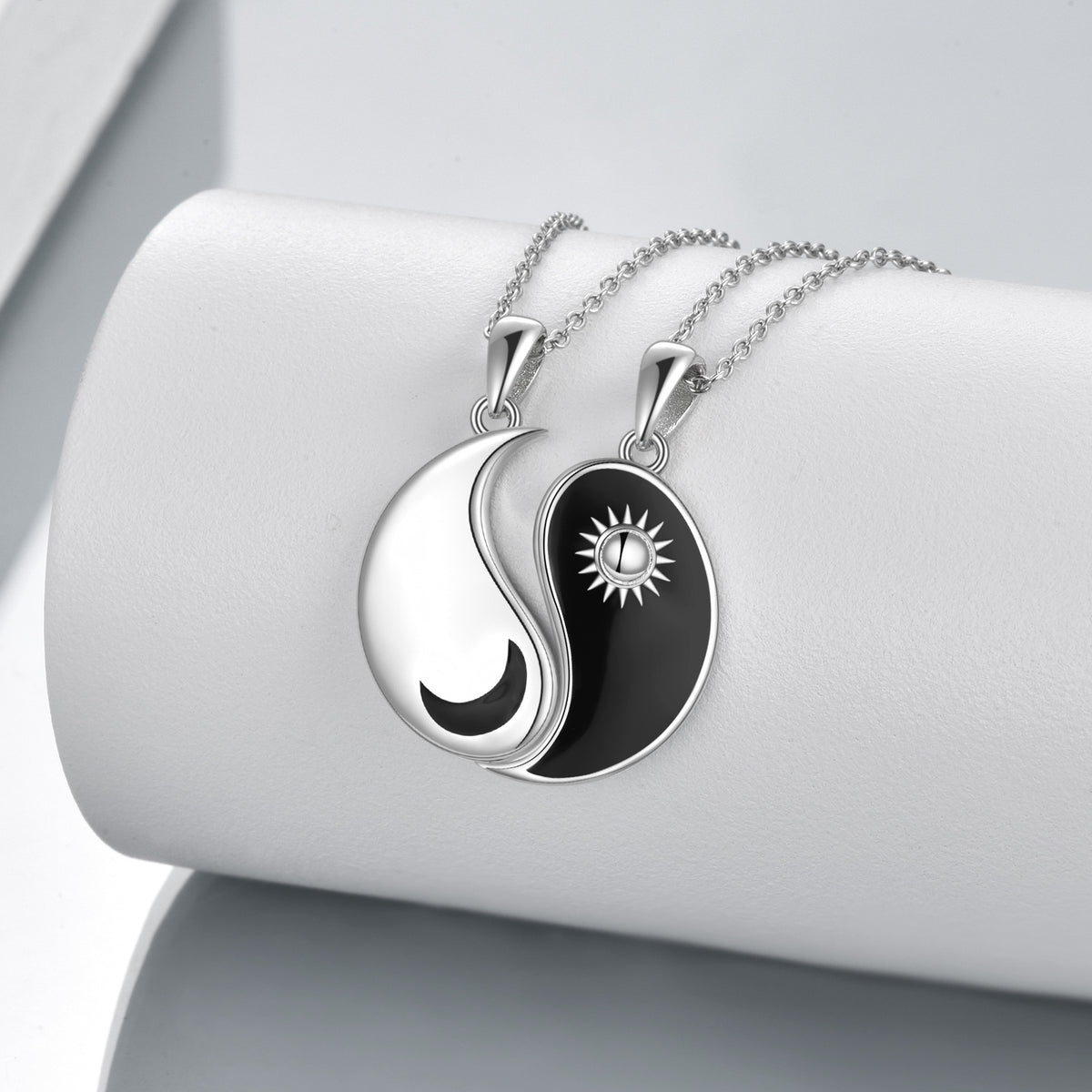 This no-stone Unisex Pendant Necklace is Crafted from Premium Sterling Silver with Silver and Black Tones (Two-tone), showcasing a Timeless Yin Yang Design with Moon and Sun Elements.