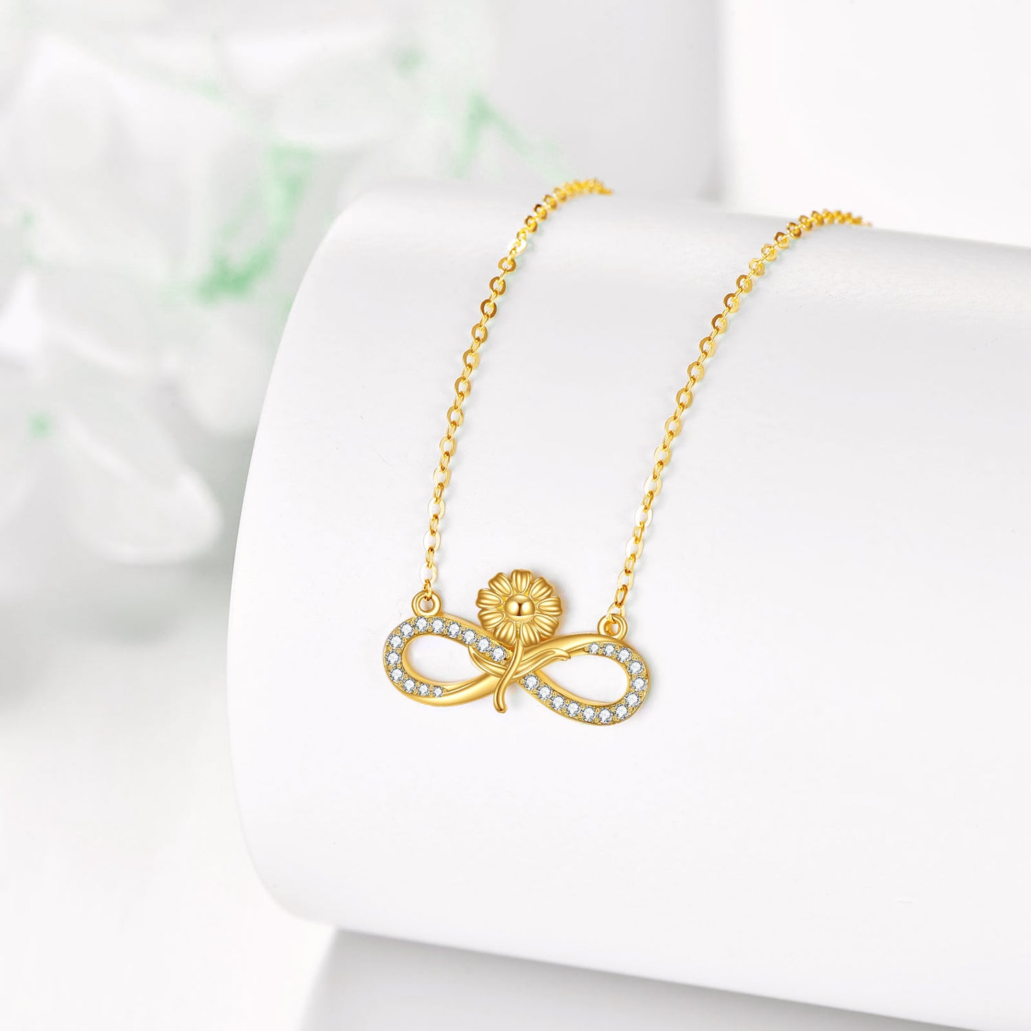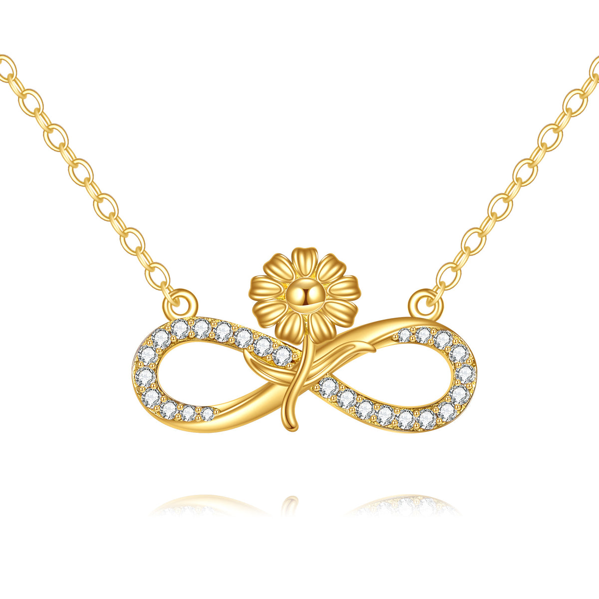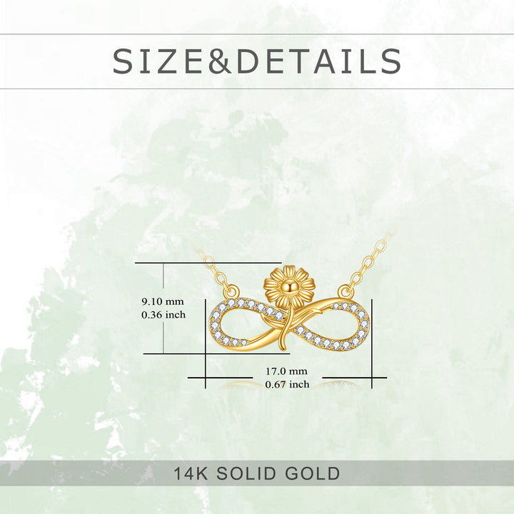 Crafted from 14K gold, featuring a Sunflower and Infinity Symbol Pendant Necklace adorned with cubic zirconia stones.
