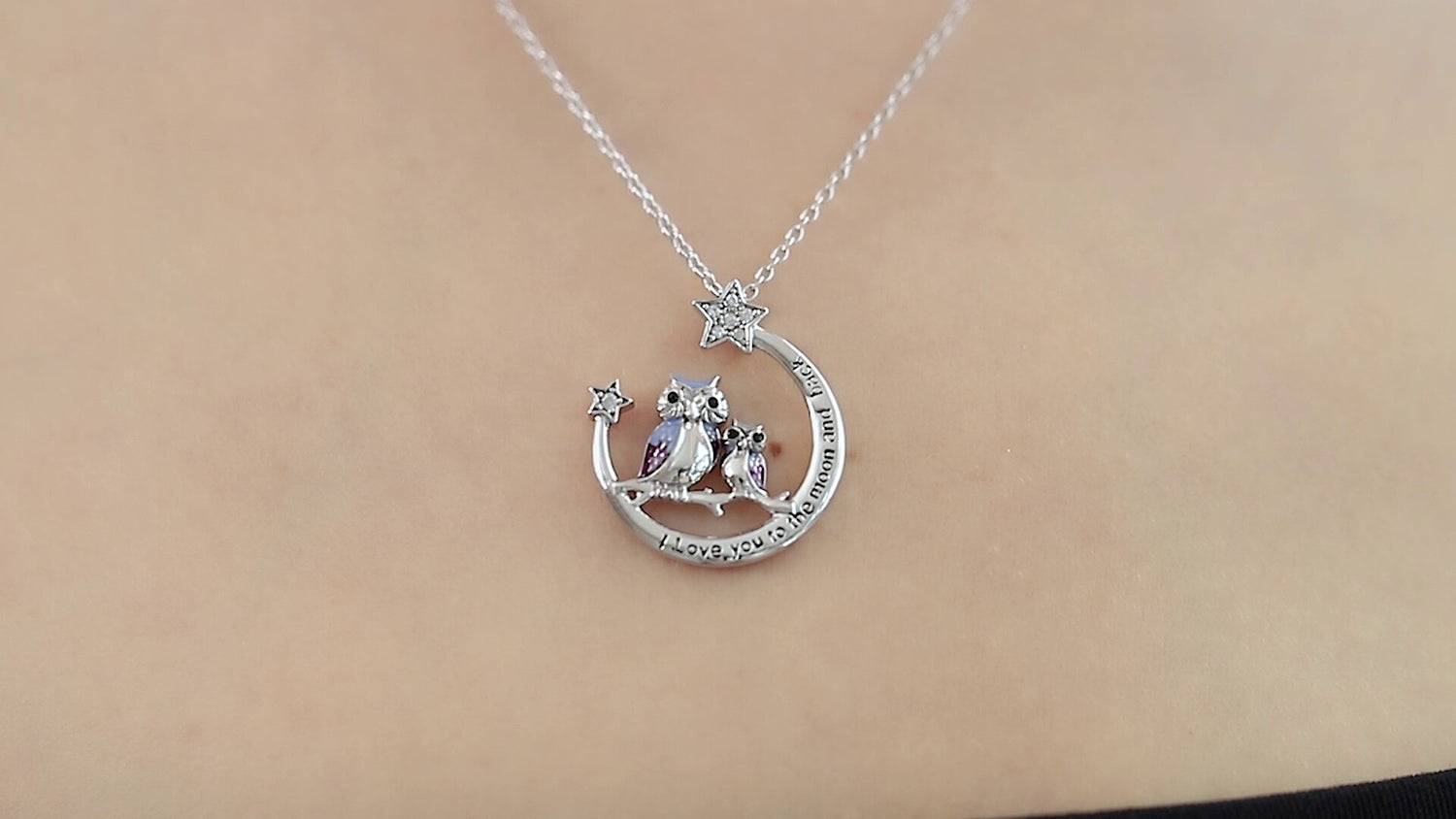 Sterling silver; white gold plating; zircon stones; owl and crescent moon pendant; includes chain.